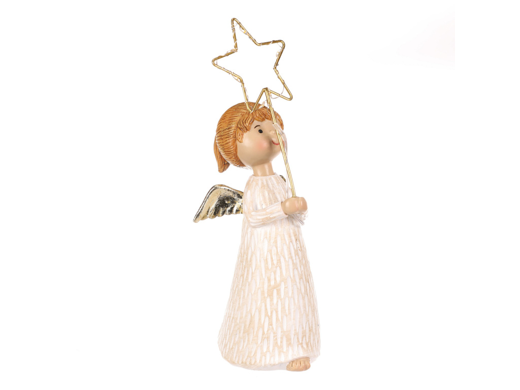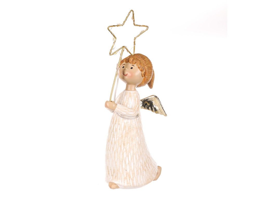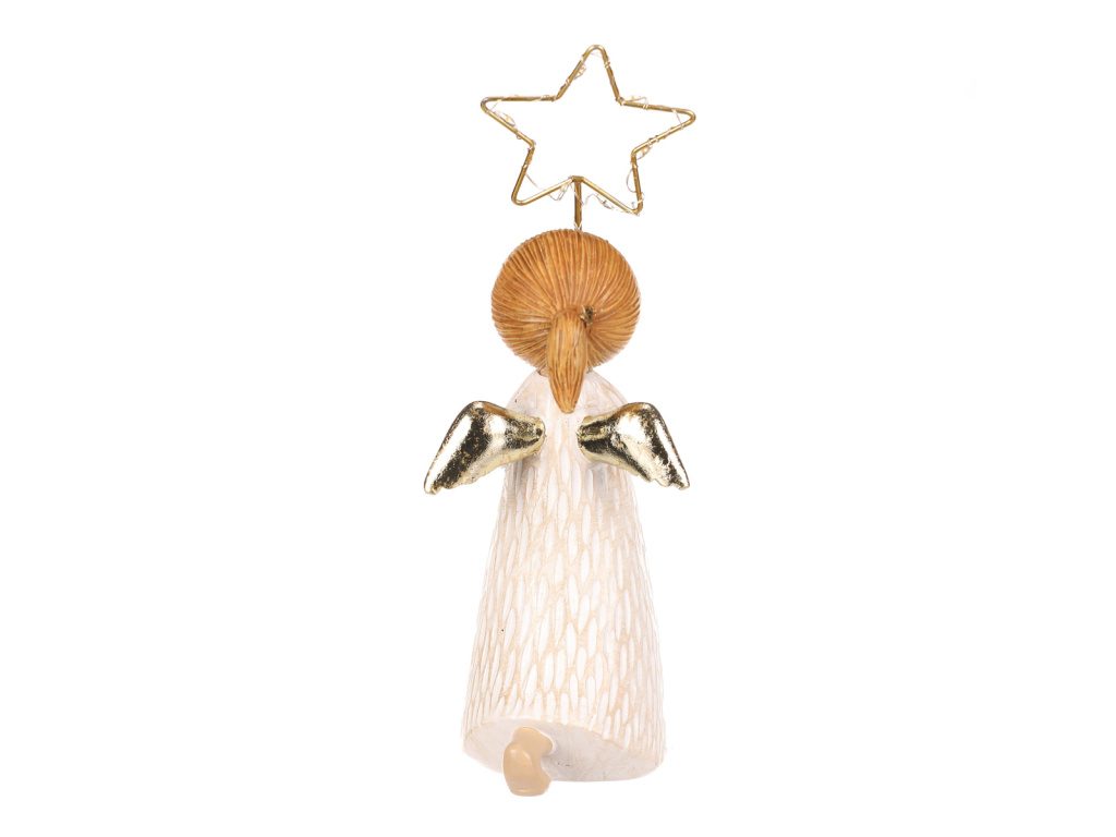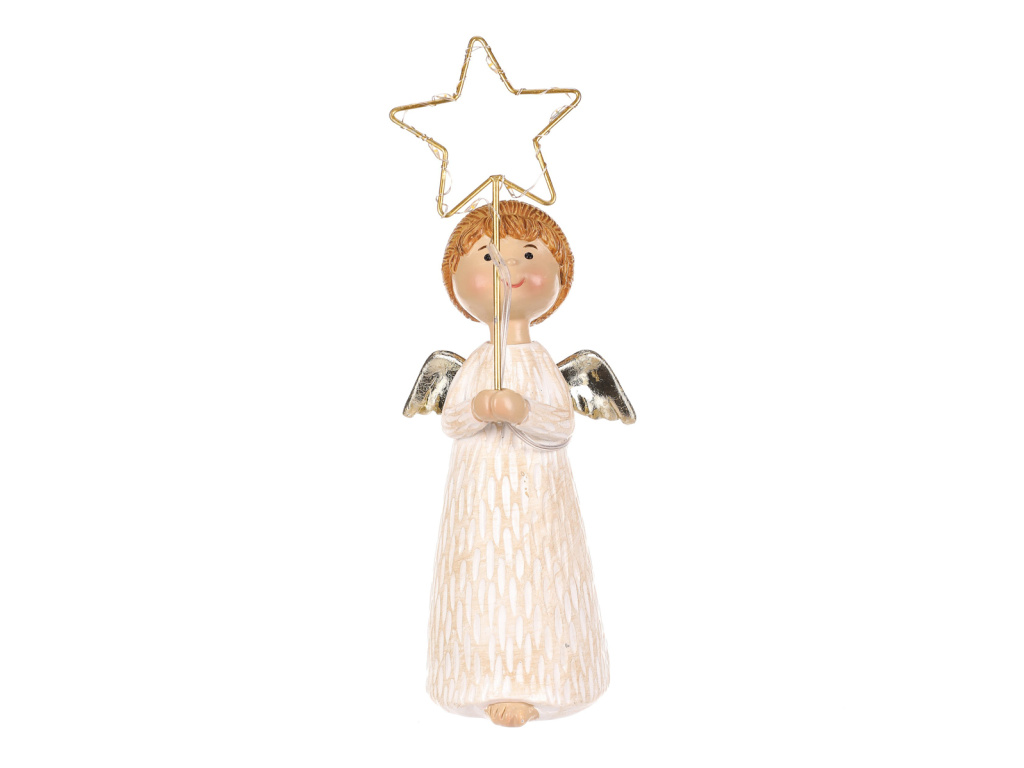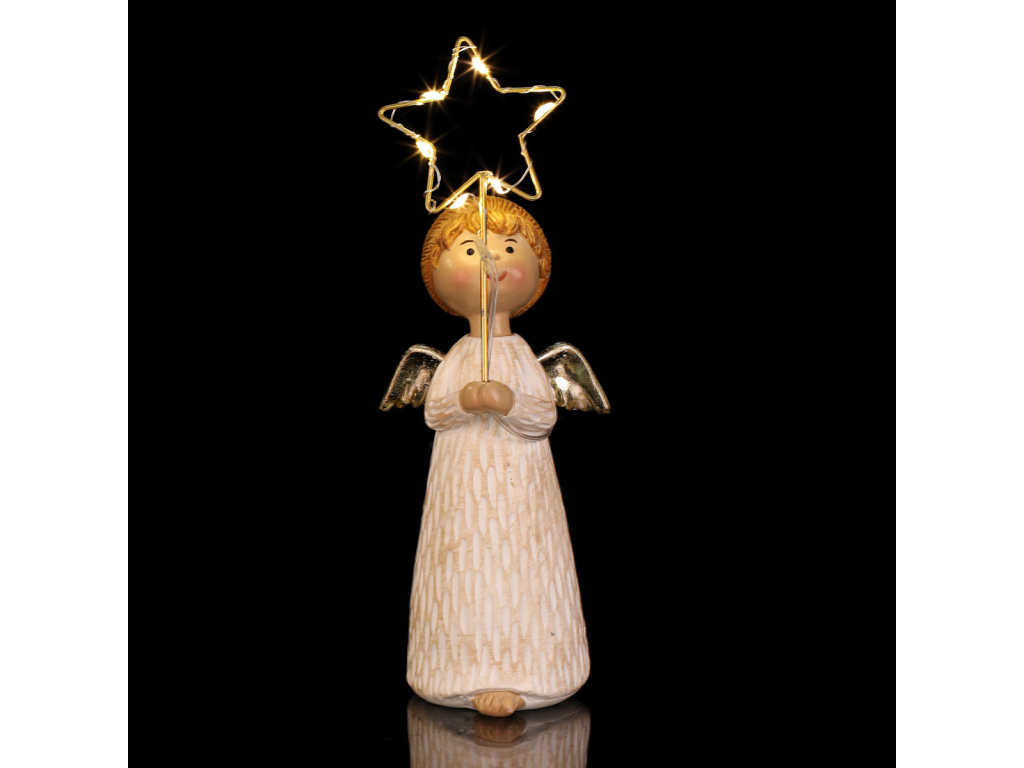 Vytvořte si kouzelné okamžiky s naším béžovým andělíčkem, který drží LED osvětlení ve tvaru hvězdy. Tato roztomilá figurka přináší do vašeho domova nejen duchovní význam, ale i příjemný a roztomilý výraz, to vše doplněné světelným prvkem. Jeho pozlacená křidélka dodávají andělíčkovi zářivý lesk, zatímco LED světlo ve tvaru hvězdy rozjasní vaše okolí. S jeho dětským vzhledem a roztomilým výrazem je ideální volbou pro vánoční výzdobu nebo jako dárek pro milovaného člověka.Doplňkové parametry