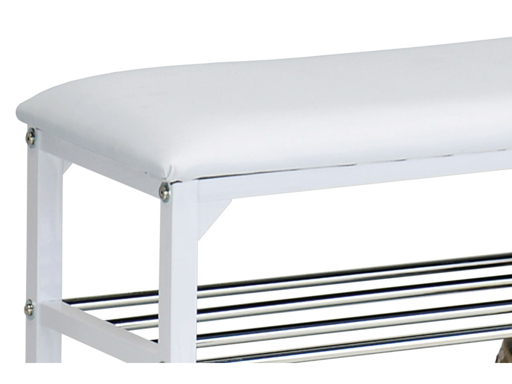 Praktický kovový botník s dvěma rošty, který zároveň slouží i jako sedací lavice. Díky svým rozměrům má ideální ložnou plochu na uložení bot, ale prostorově se vejde i do menších předsíní. Měkký sedák je potažen bílou hladkou ekokůží, výplň je z PU pěny. Kostra botníku je ze svařovaných profilů v povrchové úpravě bílou matnou práškovou barvou. Rošty jsou z kovových chromovaných trubek o průměru 12 mm. Nosnost na sezení je 90 kg, nosnost jednotlivých polic je 8 kg. Dodáváno v demontu. S tímto botníkem bude přezouvání vždy pohodlné a bezpečné.Doplňkové parametry