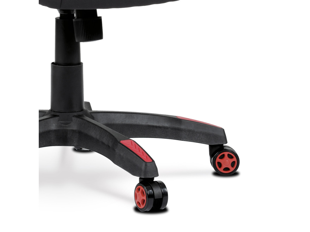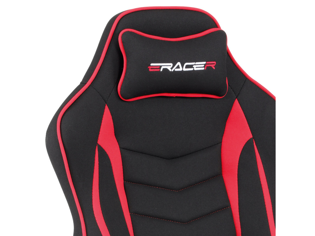 Setkání designu a sofistikované funkčnosti - to je toto herní a kancelářské křeslo. Vyznačuje se výrazným barevným kontrastem černé a červené barvy příjemného potahu a také zaoblenými liniemi. Kvalitní čalounění sedáku i opěráku je zárukou pohodlného posezení. Integrovaný polštář podhlavníku s vyšívaným logem E-racer zapadá do celkové koncepce herního křesla a zaručuje pohodu při dlouhých herních večerech. Křeslo je vybaveno houpacím mechanismem. Síla houpání se reguluje plastovým šroubem pod sedákem. Výška sezení se upravuje páčkou na pravé straně přes kvalitní plynový píst. Masivní černý plastový kříž s červenými doplňky je osazen plastovými kolečky na koberec. Nosnost je 130 kg.Doplňkové parametry