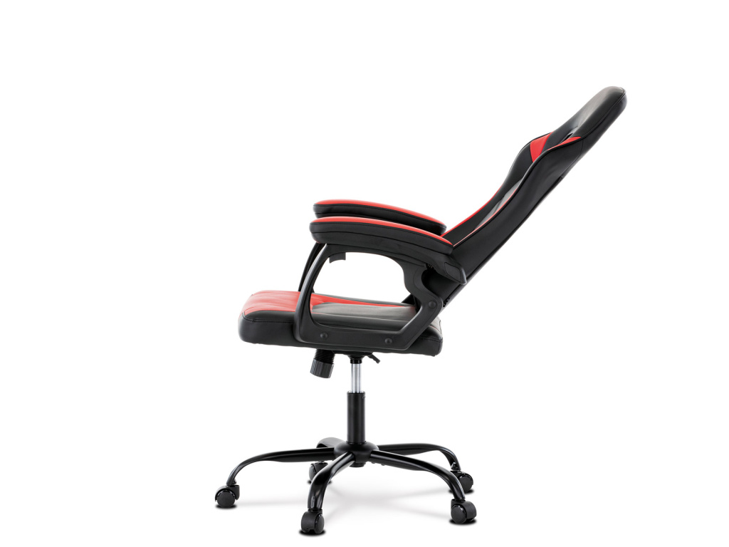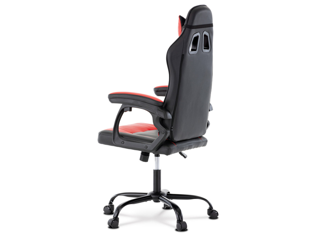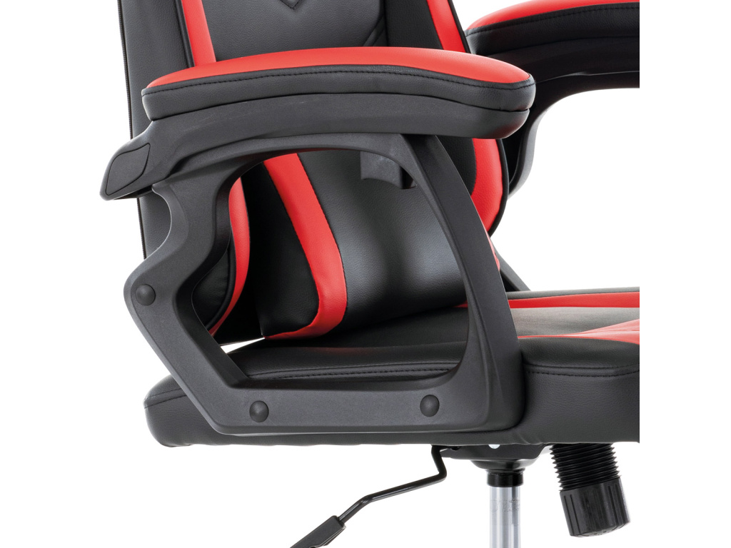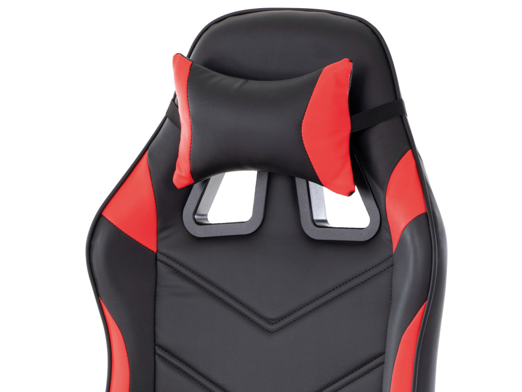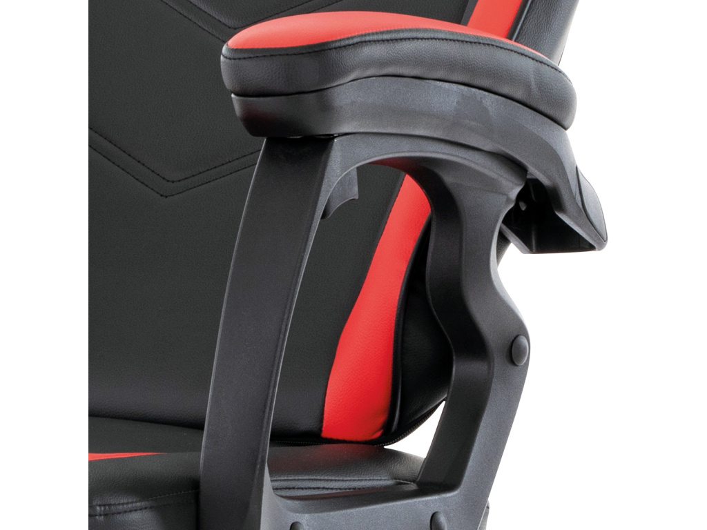 Herní křeslo v designu sedačky závodního vozu a zaoblenými liniemi a novou funkcí opěráku. Potah je kombinace černé, do V prošívané ekokůže a červené ekokůže na okrajích sedáku i opěráku a odnímatelných polštářcích. Polstrování je z kvalitní PU pěny. Židle je vybavena houpacím mechanismem s nastavením protiváhy a aretací v základní poloze. Tuhost protiváhy lze regulovat velkým plastovým šroubem, umístěným pod sedákem. Výška sezení se upravuje páčkou na pravé straně přes kvalitní plynový píst. Ruce unavené od klávesnice a rychlé myši si můžete pohodlně položit na plastové područky, na ložné ploše polstrované černou a červenou ekokůží. Opěrák je vyšší s designovými otvory v horní části lemovanými černými plastovými výlisky. Ty dodávají židli nejen potřebný závodní vzhled (otvory na bezpečnostní pásy), ale také usnadňuje manipulaci. Kříž je kovový, lakovaný černou barvou. Jednotlivé paprsky jsou šroubované k centrálnímu nosníku s pístem. Kolečka jsou plastová, vhodná na koberce. Nosnost židle je až 120 kg. Jako novou funkci můžete využít několikanásobné polohování opěráku, a to až do 135°. Stačí jen zmáčknou tlačítko umístěné pod područkami a opěrák společně s područkami se bude posouvat do stále větší relaxační polohy.Doplňkové parametry