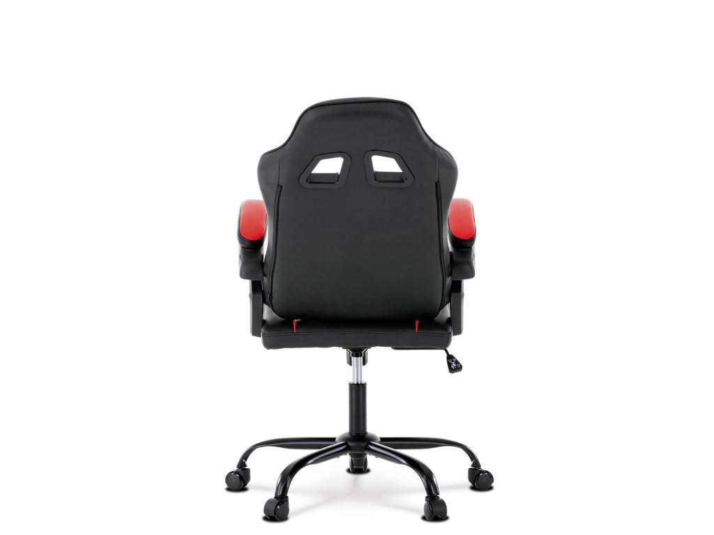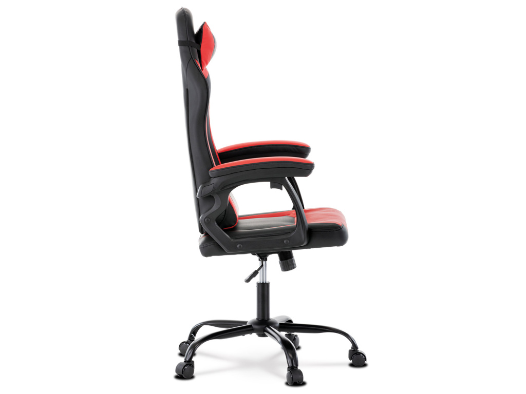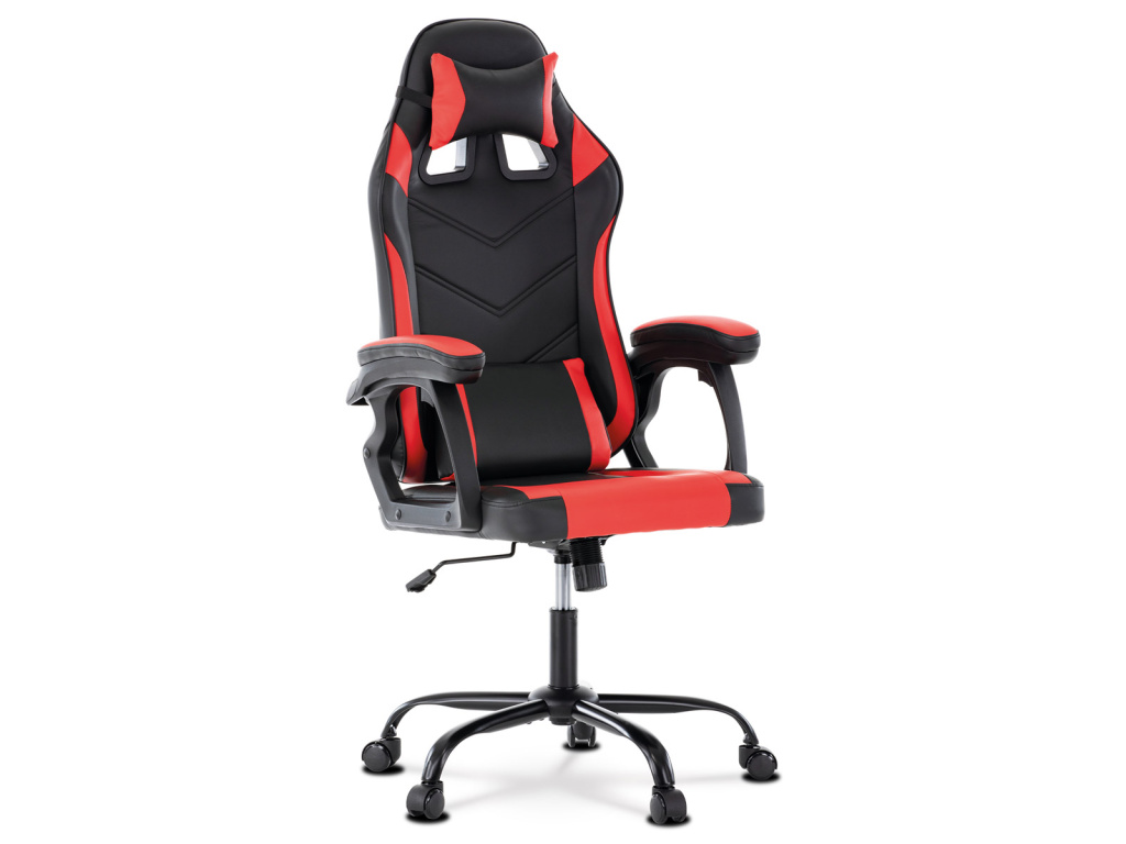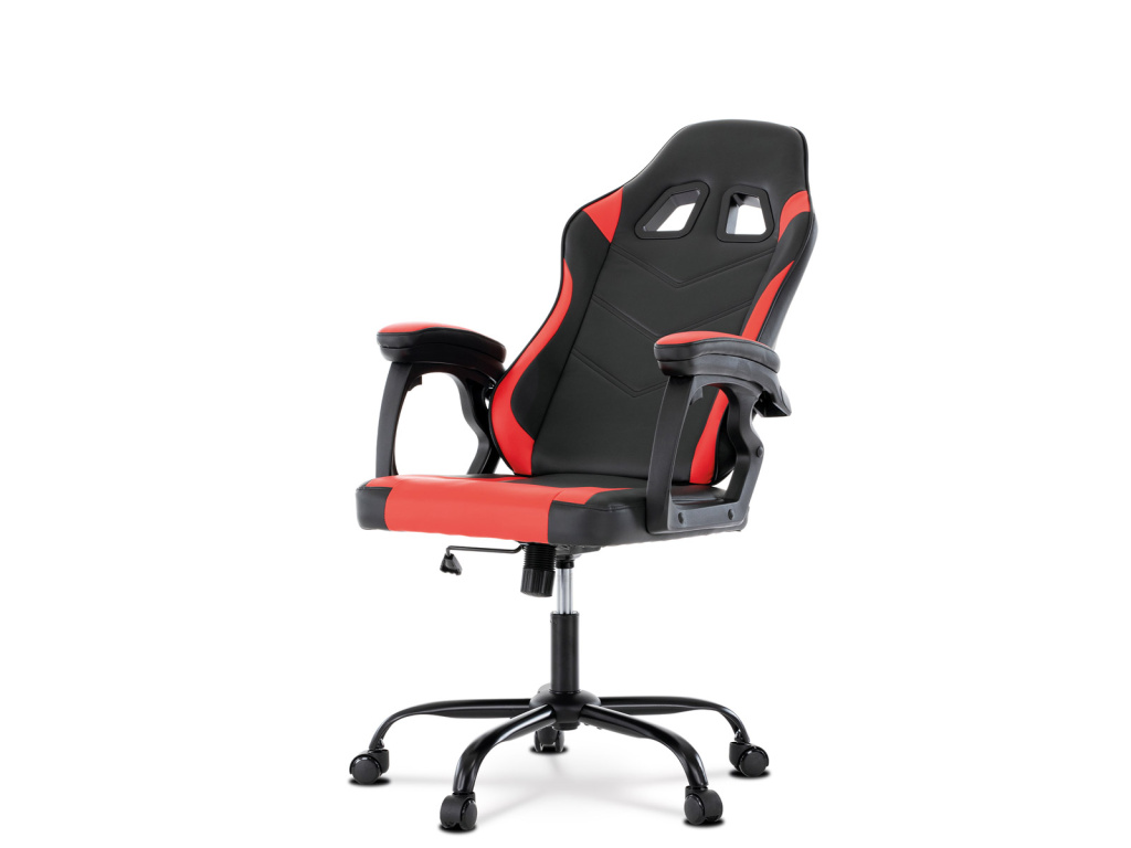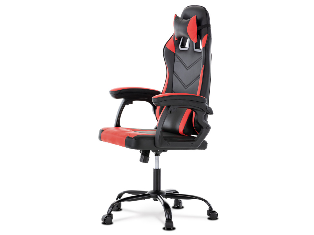 Herní křeslo v designu sedačky závodního vozu a zaoblenými liniemi a novou funkcí opěráku. Potah je kombinace černé, do V prošívané ekokůže a červené ekokůže na okrajích sedáku i opěráku a odnímatelných polštářcích. Polstrování je z kvalitní PU pěny. Židle je vybavena houpacím mechanismem s nastavením protiváhy a aretací v základní poloze. Tuhost protiváhy lze regulovat velkým plastovým šroubem, umístěným pod sedákem. Výška sezení se upravuje páčkou na pravé straně přes kvalitní plynový píst. Ruce unavené od klávesnice a rychlé myši si můžete pohodlně položit na plastové područky, na ložné ploše polstrované černou a červenou ekokůží. Opěrák je vyšší s designovými otvory v horní části lemovanými černými plastovými výlisky. Ty dodávají židli nejen potřebný závodní vzhled (otvory na bezpečnostní pásy), ale také usnadňuje manipulaci. Kříž je kovový, lakovaný černou barvou. Jednotlivé paprsky jsou šroubované k centrálnímu nosníku s pístem. Kolečka jsou plastová, vhodná na koberce. Nosnost židle je až 120 kg. Jako novou funkci můžete využít několikanásobné polohování opěráku, a to až do 135°. Stačí jen zmáčknou tlačítko umístěné pod područkami a opěrák společně s područkami se bude posouvat do stále větší relaxační polohy.Doplňkové parametry