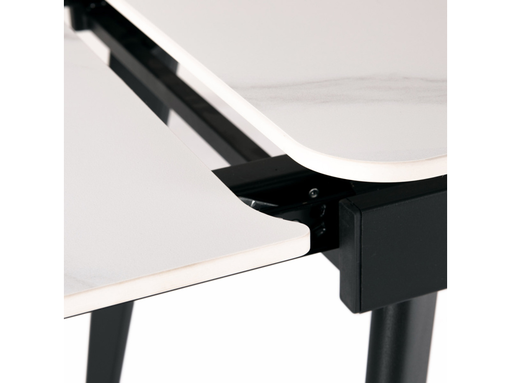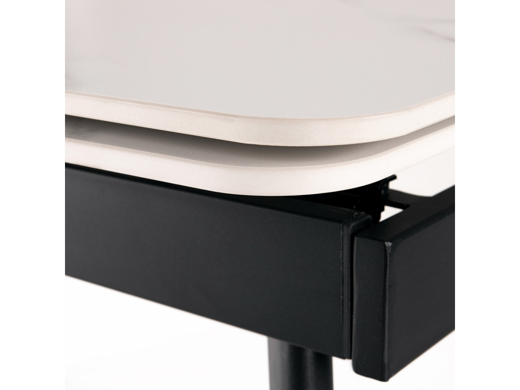 Designový jídelní rozkládací stůl o rozměru 120 + 30 + 30 x 80 cm v industriálním minimalistickém stylu. Vrchní stolová deska je tvrzené keramiky tl. 12 mm v matném dekoru "Italský sněhobílý mramor". Konstrukce stolu i nohy jsou celokovové s nástřikem práškového vypalovacího laku v matném černém odstínu. Plastové kluzáky na nohách eliminují možnost poškození povrchů tvrdých podlah. Rozkládání je výsuvné, díly o šíři 30 cm se vysouvají z obou kratších stran, mechanika je celokovová a pro usnadnění jak výsuvu, tak i zajištění, je opatřena pružinami a plynovými písty. Stůl zaujme jak svým minimalistickým designem i skvělým zpracováním detailu, ale také provedením desky se zakulacenými rohy a v neposlední řadě také dekorem vrchní desky, imitující jeden z nejkvalitnějších a nejžádanějších mramorů na světě. Jistě se stane se velmi elegantním a nepřehlédnutelným prvkem v moderních - industriálních, ale i klasicky laděných jídelnách, kuchyních a obývacích prostorách. Výška stolu je 76 cm. Ke stolu je možné umístit až 8 židlí. Bílý mramor (Carrarský mramor) je jedním z nejznámějších mramorů na světě, pochází z italského města Carrara v regionu Toskánska, kde se těží už od konce římské republiky. Jedná se o čistě bílý mramor s jemným šedým žilkováním. Použití je velmi široké, od sochařství (Michelangelo, Bernini, Donatello) až po stavebnictví současné i historické.Doplňkové parametry