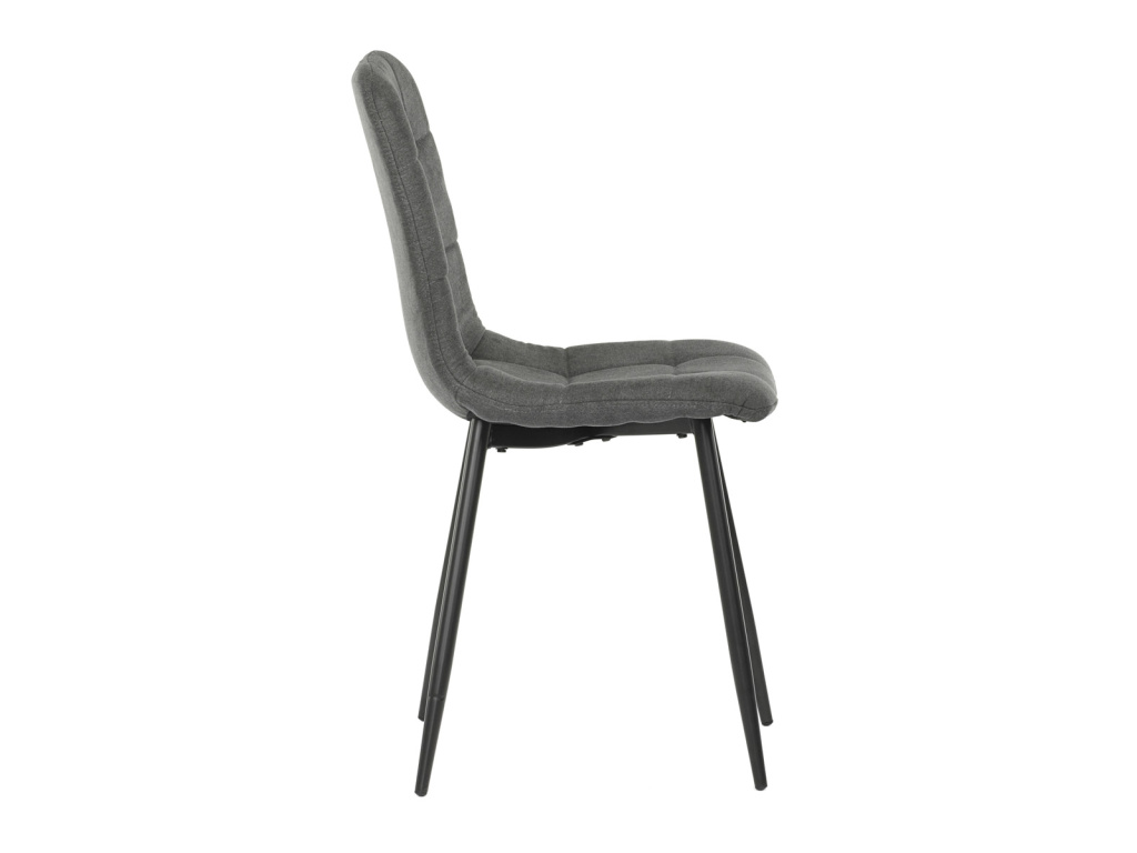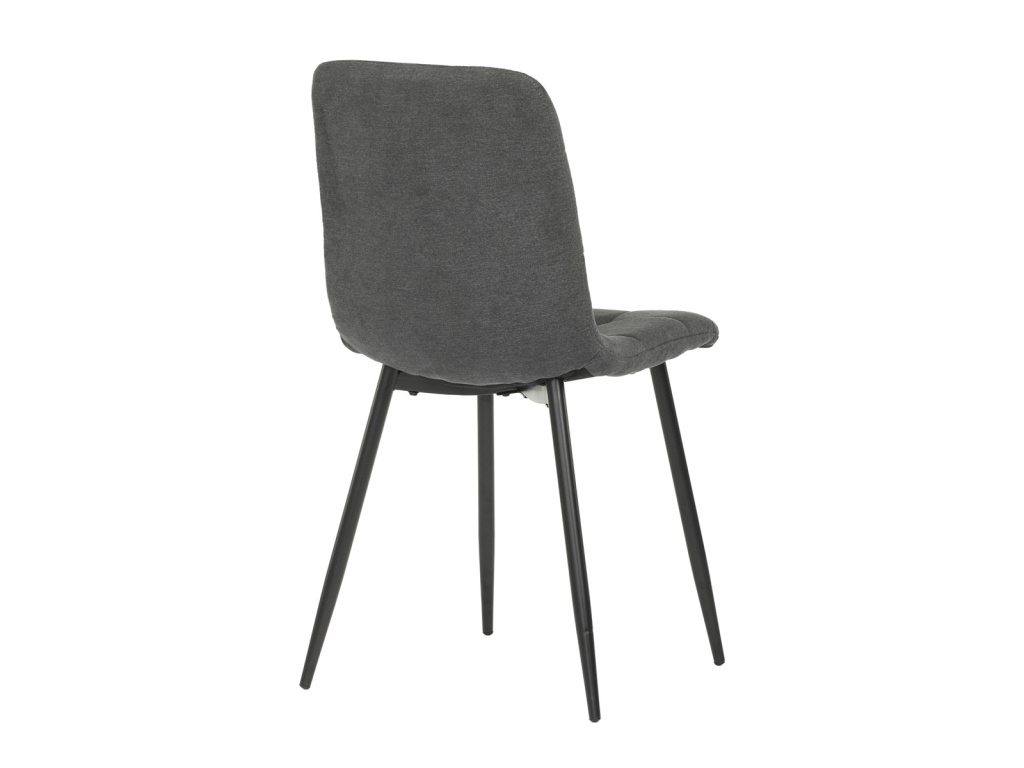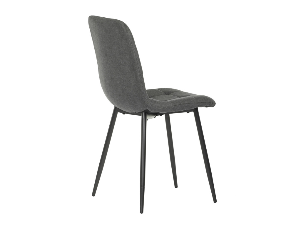 Jídelní minimalistická židle v industriálním stylu. Potah je z jemně hrubé látky v temně šedém odstínu. Velmi dekorativní a výrazné je čtvercové prošívání čelních ploch sedáku i opěradla s čalounickými vtahy. Polstrování je z kvalitní PU pěny. Stabilitu židle zajišťují čtyři kónické kovové nohy s kvalitním práškovým nástřikem v černé matné barvě. Ukončené jsou černými plastovými kluzáky, zabraňující poškození tvrdých povrchů podlah. Nohy jsou kruhového průřezu o nejvyšším průměru 2,5 cm. Tento minimalistický a strohý design jídelních židlí je velmi oblíben pro svoji nadčasovost i pohodlí, které poskytuje a také variabilitu. Můžete ji bez obav použít k široké škále stolů v různých materiálech i provedeních. Maximální nosnost židle je až 120 kg. Základní rozměry – celková šíře 44 cm, celková hloubka 52 cm, celková výška 91 cm a výška sedu 46 cm. Montáž není složitá, zvládne ji i méně zručný nový majitel této židleDoplňkové parametry
