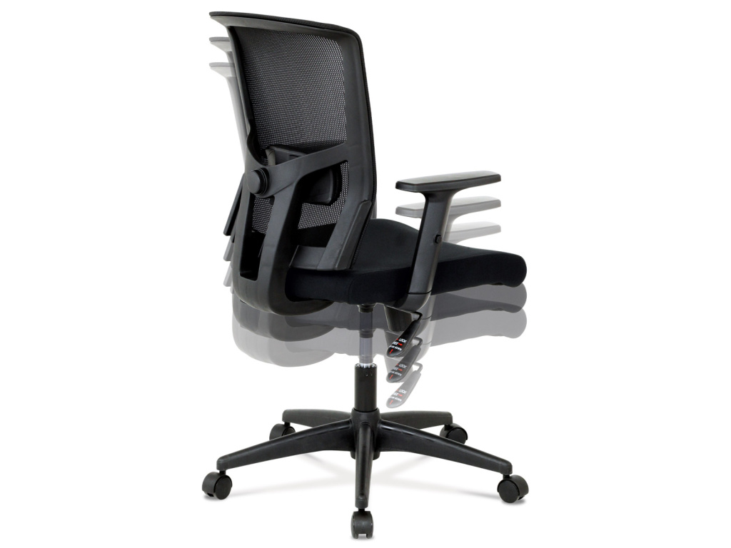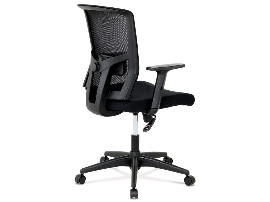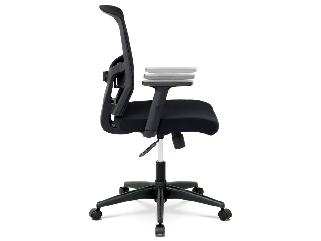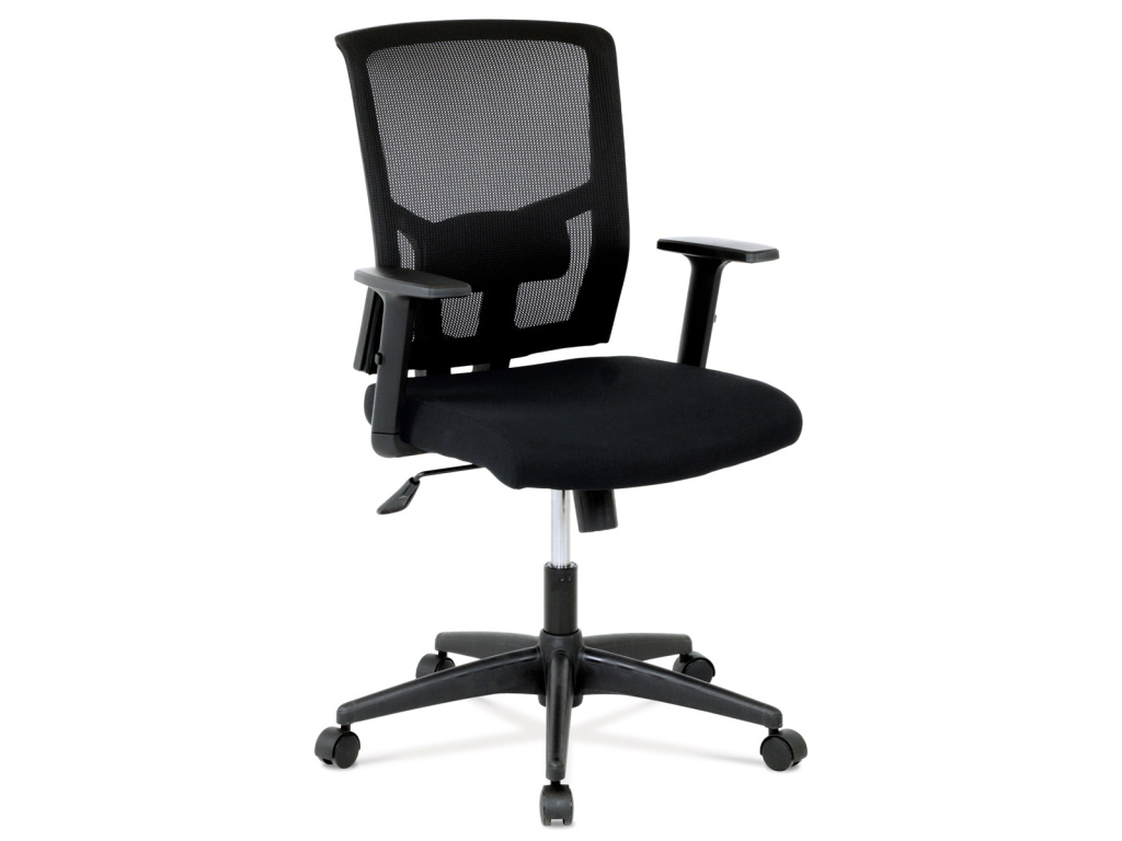 Kancelářská židle s výškově nastavitelnými područkami, pasivní bederní opěrkou a plastovým křížem s plastovými kolečky vhodnými na koberce. Opěrák je potažen síťovinou a sedák je očalouněn černou látkou. Židle je výškově nastavitelná s houpacím mechanismem. Nosnost židle je až 120 kg.Doplňkové parametry