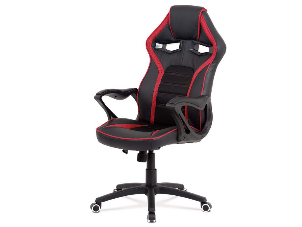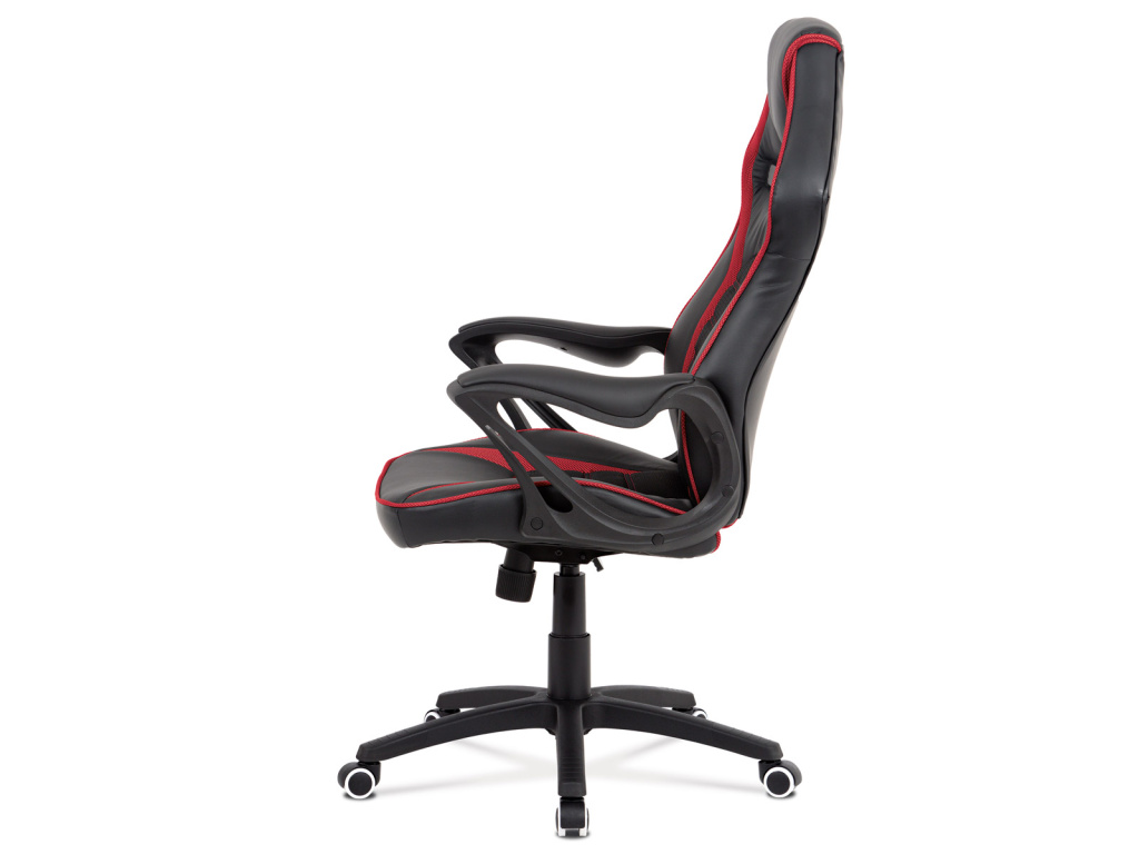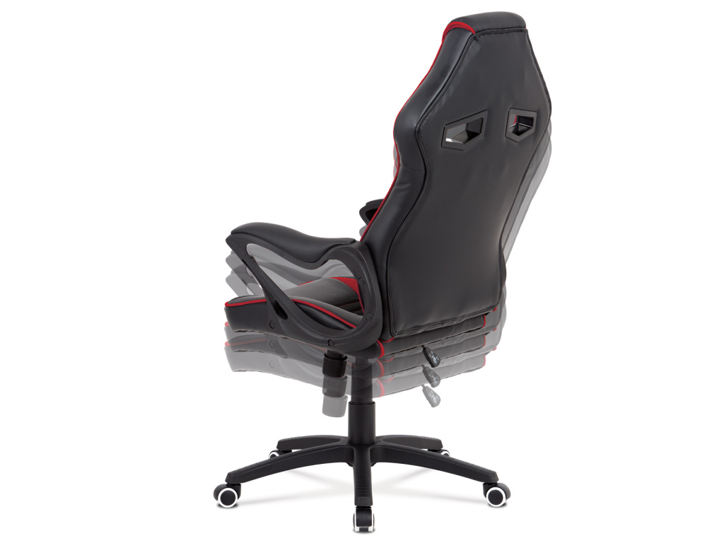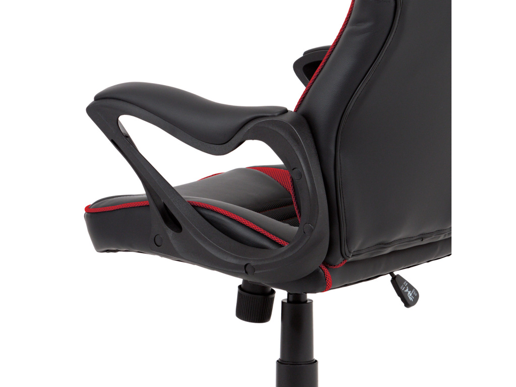 Herní kancelářská židle potažená černou ekokůží v kombinaci s červenou a černou látkou MESH v liniích sedáku i opěráku. Výplň je z kvalitní PU pěny. Herní design dodává židli jedinečný vzhled i pohodlí, které Vám budou závidět ostatní hráči. Opěrák disponuje nejen pohodlným podhlavníkem, ale také dvěma plastovými otvory, které přidávají na stylovém vzhledu závodního sedadla. Ruce si můžete pohodlně opřít o pevné plastové područky s dekorativně profilovaným polstrováním v černé ekokůži. Židle má kříž z černého tvrzeného plastu, s protiskluzovými prvky a plastovými kolečky vhodnými na tvrdé typy podlah (dlažba, parkety, plovoucí podlahy apod.). Židle je výškově nastavitelná, s houpacím mechanismem. Tuhost pohupu upravujeme předním masivním šroubem. Nosnost židle je až 120 kg.Doplňkové parametry