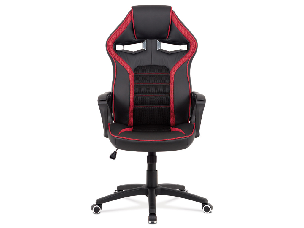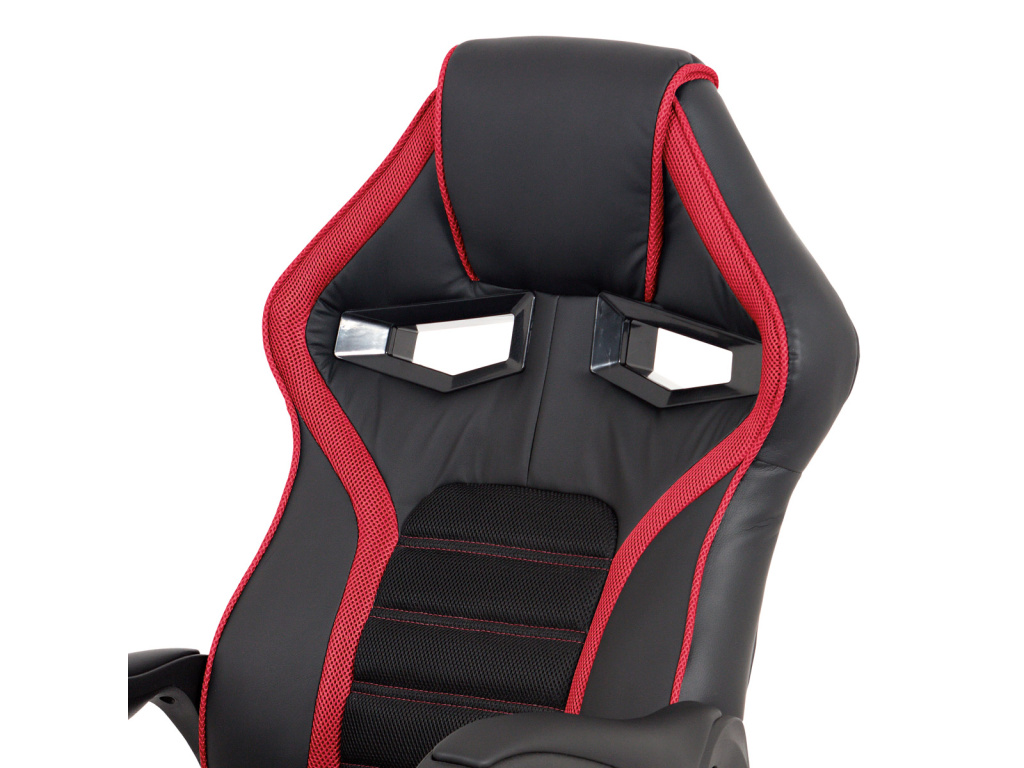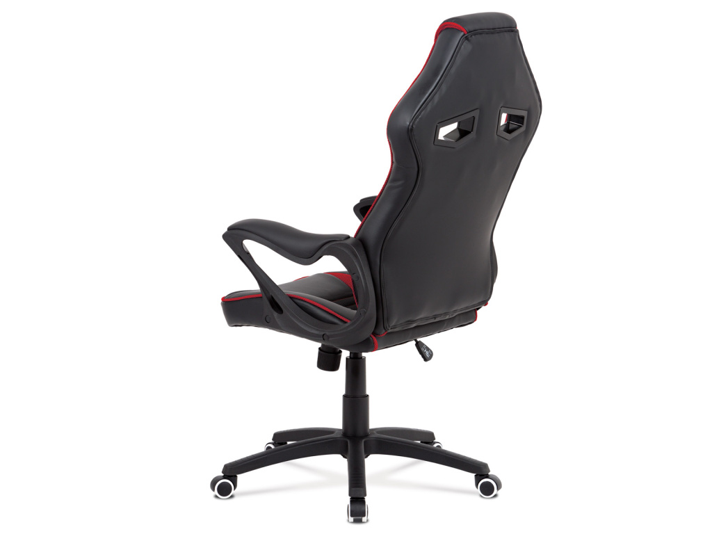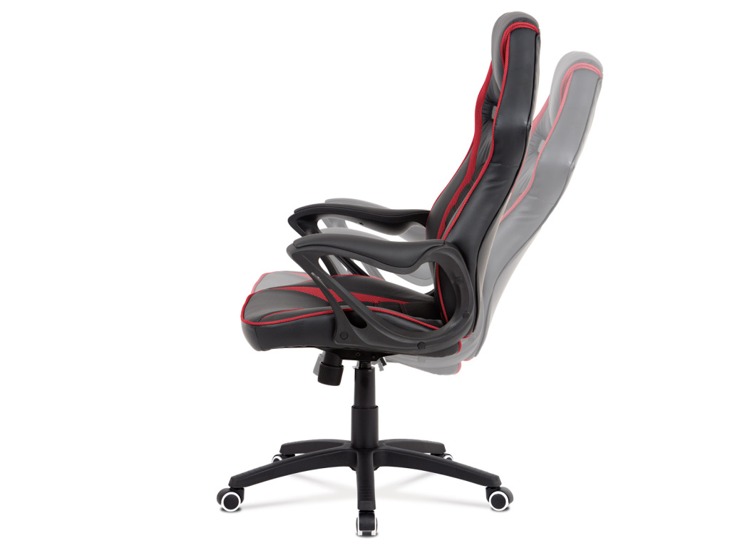 Herní kancelářská židle potažená černou ekokůží v kombinaci s červenou a černou látkou MESH v liniích sedáku i opěráku. Výplň je z kvalitní PU pěny. Herní design dodává židli jedinečný vzhled i pohodlí, které Vám budou závidět ostatní hráči. Opěrák disponuje nejen pohodlným podhlavníkem, ale také dvěma plastovými otvory, které přidávají na stylovém vzhledu závodního sedadla. Ruce si můžete pohodlně opřít o pevné plastové područky s dekorativně profilovaným polstrováním v černé ekokůži. Židle má kříž z černého tvrzeného plastu, s protiskluzovými prvky a plastovými kolečky vhodnými na tvrdé typy podlah (dlažba, parkety, plovoucí podlahy apod.). Židle je výškově nastavitelná, s houpacím mechanismem. Tuhost pohupu upravujeme předním masivním šroubem. Nosnost židle je až 120 kg.Doplňkové parametry