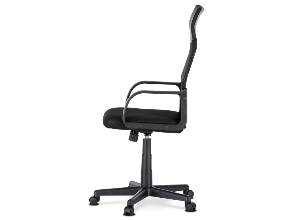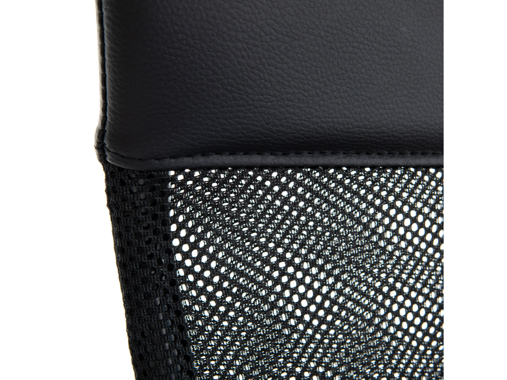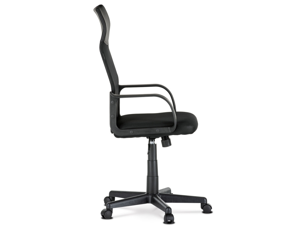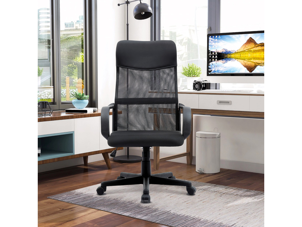 Oblíbená a nadčasová kancelářská židle decentní černé barvy je vhodná nejen do kanceláří, ale například i pro Home office. Vysoký trubkový opěrák s bederní opěrkou je potažen černou síťovinou MESH a v horní části jako podhlavník slouží velmi praktický potah z černé ekokůže. Použité materiály na sedáku i zádové části opěráku zaručují dokonalou prodyšnost. Příjemný polstrovaný sedák je potažený černou látkou MESH. Výplň je v kvalitní PU pěny, která zaručuje příjemné dlouhodobé sezení. Ruce si můžete pohodlně opřít o 6 cm široké černé plastové područky s velkou ložnou plochou 35 cm. Područky zároveň slouží jako velmi pevné spojovací díly sedáku s opěrákem. Díky kvalitnímu plynovému pístu je židle výškově nastavitelná, vybavená houpacím mechanismem a velkým aretačním šroubem na úpravu tuhosti pohupu, který je umístěn pod sedákem. Správnou stabilitu a pevnost zajišťuje pětiramenný černý plastový kříž o pr. 60 cm s plastovými kolečky vhodnými na koberce. Nosnost židle je až 120 kg.Doplňkové parametry