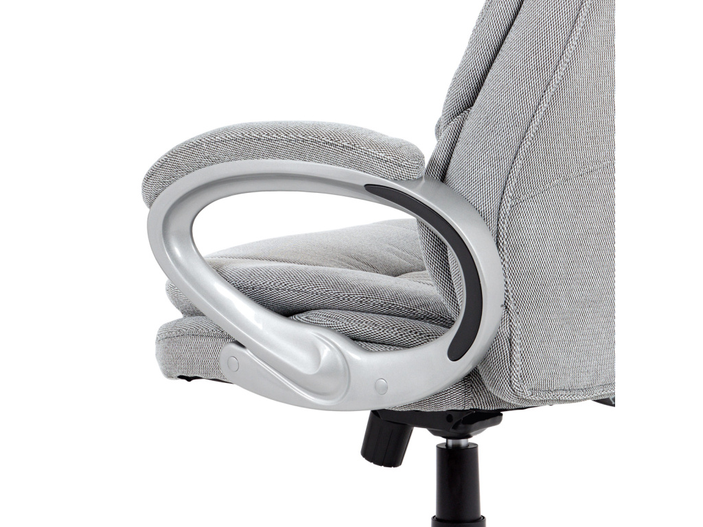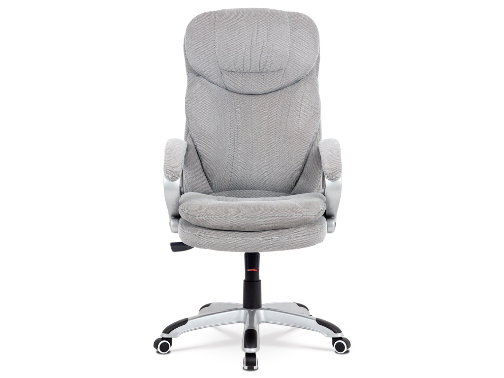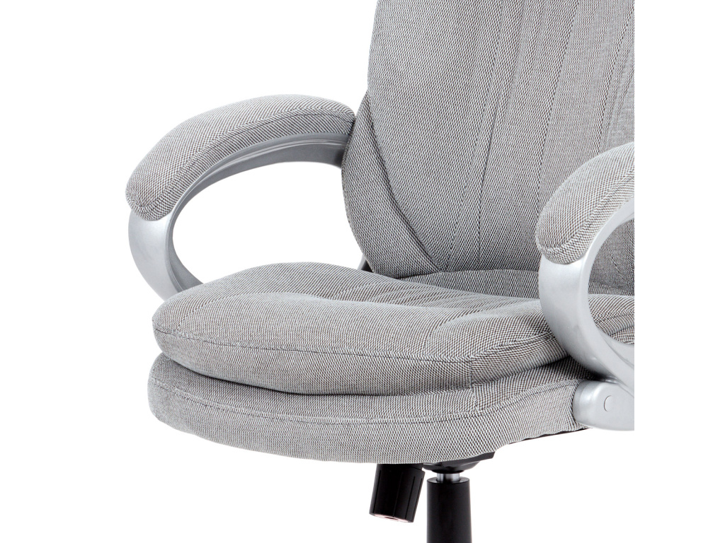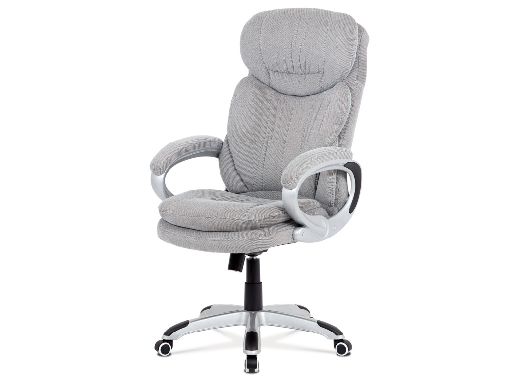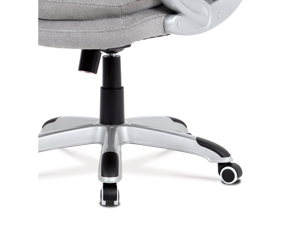 Moderní kancelářská židle potažená pololesklou šedostříbrnou látkou vzor pepito. Díky ultra pohodlnému sedáku a opěráku s výjimečným polstrováním, které jsou stylově tvarované, s elegantním prošitím a se super měkkým podhlavníkem se budete cítit jako v business class nejlepší letecké společnosti. Ruce si můžete pohodlně opřít o pevné plastové područky stříbrné barvy s černými plastovými doplňky a polstrováním potaženým extra jemnou látkou. Židle má také i snadno omyvatelný, tvrzený, plastový kříž stříbrné barvy s černými protiskluzovými prvky a plastovými kolečky vhodnými na tvrdé typy podlah (dlažba, parkety, plovoucí podlahy apod.). Je výškově nastavitelná, s houpacím mechanismem a předním šroubem upravujícím tuhost pohupu a její nosnost je až 120 kg. Látku čistit výhradně šamponováním běžnými čistícími prostředky za použití měkkého materiálu (houbička, hadřík). Nečistit hrubými materiály (kartáč, apod.). Nikdy nepoužívat chemická rozpouštědla. Látku nevystavujte přímému slunečnímu záření. Veškeré nečistoty je třeba odstraňovat ihned po ušpinění. Pozdním čištěním se úspěšnost zákroku výrazně snižuje. Látku nevystavujte přímému slunečnímu záření.Doplňkové parametry
