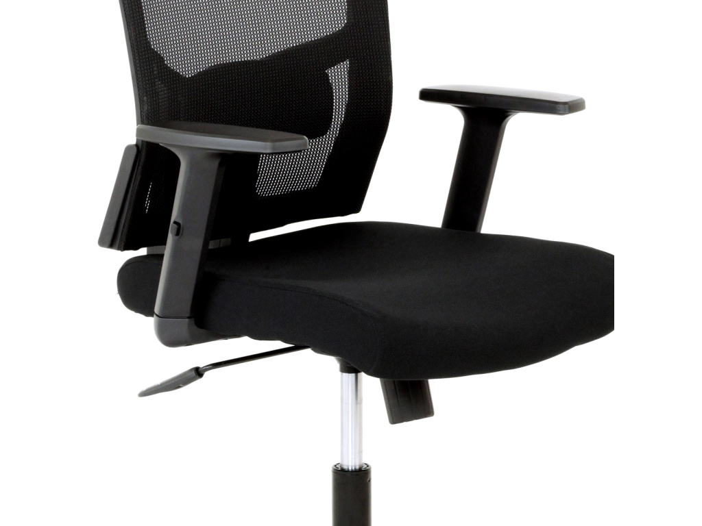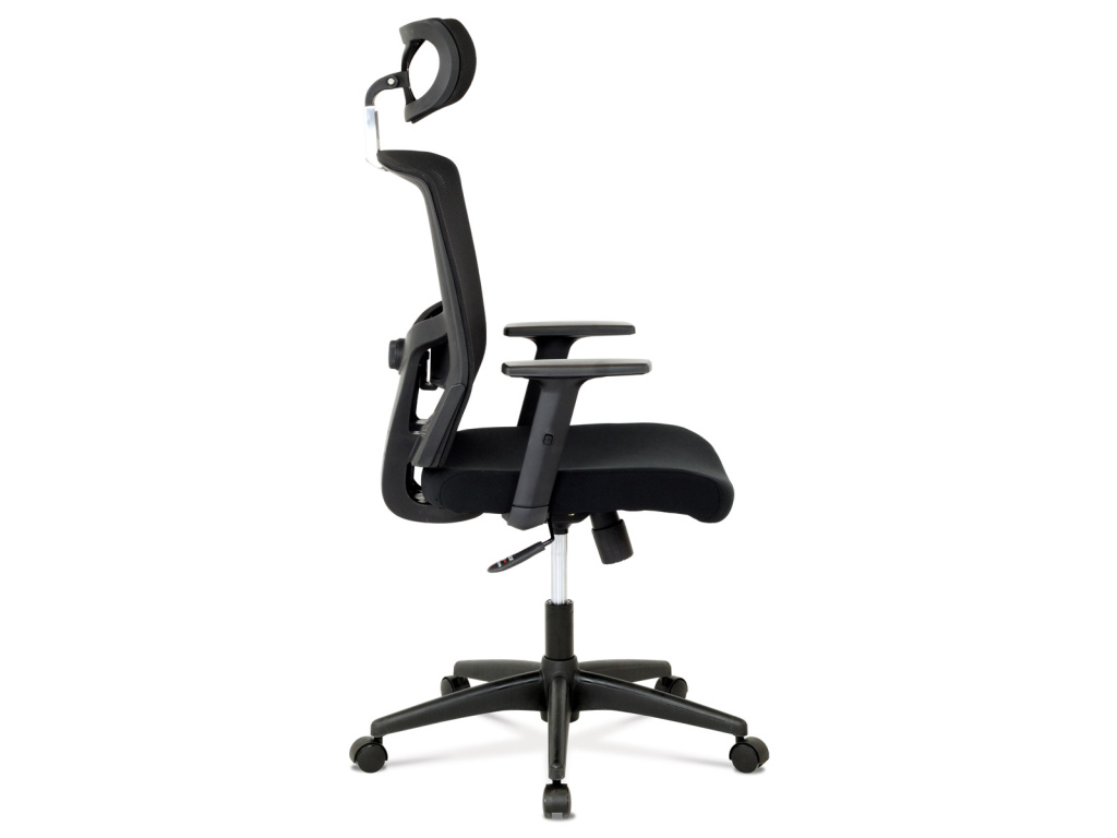 Oblíbená kancelářská židle decentní černé barvy se je vhodná nejen do kanceláří, ale například i pro Home office. Celoplastový opěrák se středovou výztuhou ve tvaru V s nastavitelnou bederní opěrkou je potažen černou síťovinou MESH. Příjemný polstrovaný sedák je čalouněný černou látkou. Výplň je v kvalitní PU pěny, která zaručuje příjemné dlouhodobé sezení. Vaše pohodlí je pro nás to nejdůležitější, a proto má tato židle elegantní a výškově nastavitelnou opěrku hlavy, která je potažena černou síťovinou a díky tomu je dokonale prodyšná. Ruce si můžete pohodlně opřít o výškově nastavitelné plastové područky z černého plastu. Díky kvalitnímu plynovému pístu je židle výškově nastavitelná, vybavená houpacím mechanismem a velkým aretačním šroubem na úpravu tuhosti pohupu, který je umístěn pod sedákem. Správná stabilita zajišťuje černý pětiramenný plastový kříž s plastovými kolečky vhodnými na koberce. Nosnost židle je až 120 kg.Doplňkové parametry