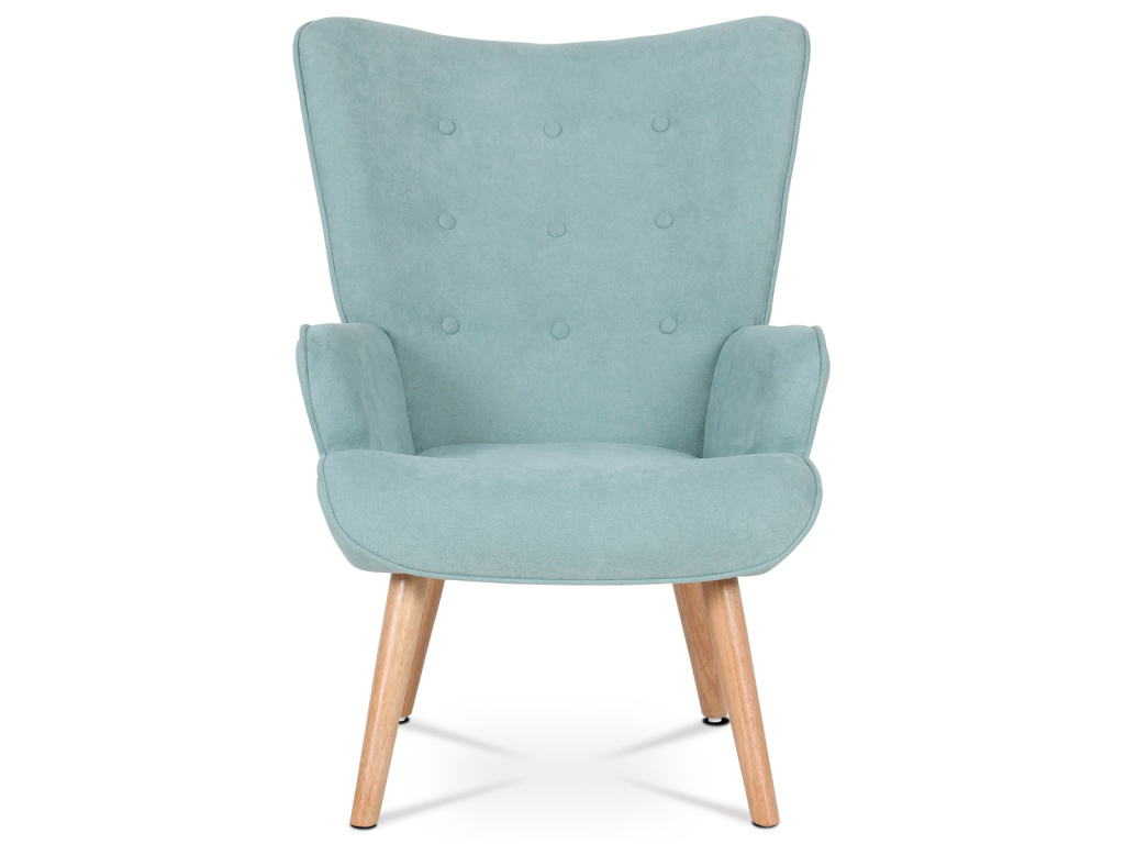 Křeslo minimalistických linií ve skandinávském stylu. Vyniká vysokým prohnutým opěrákem, úzkými a krátkými područkami a dekorativními jemnými čalounickými vtahy zakončenými knoflíky na čelní straně opěráku. To vše vytváří charakteristické severské retro linie tohoto křesla. Nejen design, ale hlavně pohodlí které Vás obklopí při usednutí, bude příjemné zpestření při chvílích odpočinku a relaxace. A k jeho zvýšení výborně poslouží i čtyřnohá a polstrovaná podnožka na vyložení nohou, kterou ale můžete použít i jako příležitostný taburet. Potah je z trendy světle modré látky, kostra z masivního dřeva a výplň z kvalitní PU pěny. V místě sedáku jsou pro zkvalitnění sezení elastické popruhy. Dlouhé kónické dřevěné nohy jsou z masivního kaučukovníku v přírodním odstínu a lakované transparentním lakem. Aby bylo eliminováno poškození podlahové krytiny, jsou opatřeny plastovými kluzáky. U zadních nohou rektifikovatelnými. Světlá výška křesla je 32 cm, výška područek je 58 cm a šíře 6 cm. Nosnost křesla je 130 kg, taburetu do 80 kg.Doplňkové parametry