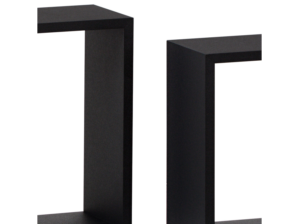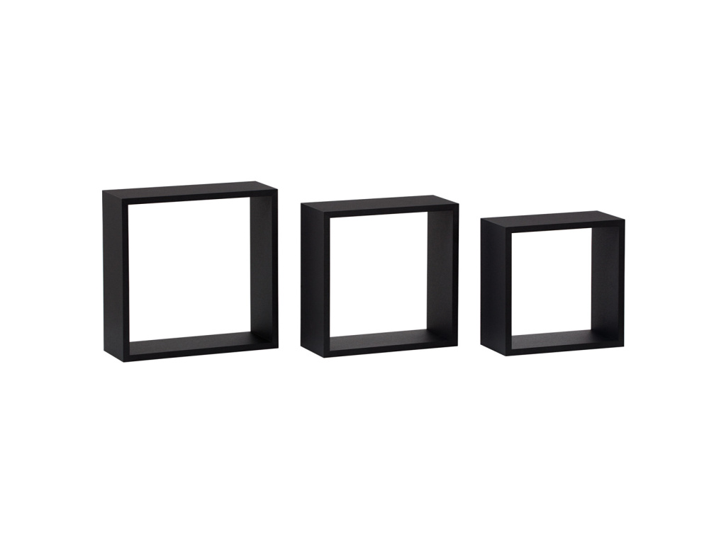 Sada 3 ks moderních nástěnných poliček různých velikostí v minimalistickém designu a čtvrecového tvaru. Provedení je v černé matné barvě s jemnou strukturou. Rám je z MDF, povrch matné lamino. Balení obsahuje poličku, šrouby a hmoždinky pro uchycení. Nosnost poličky je 5-15 kg podle druhu nosného zdiva.Doplňkové parametry