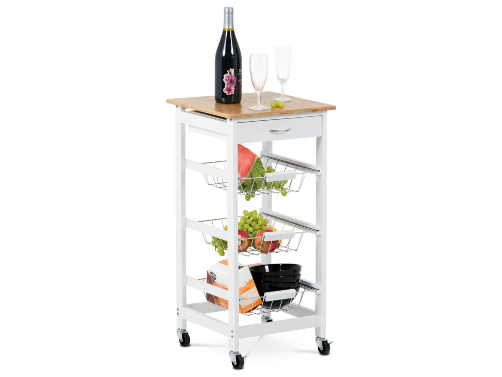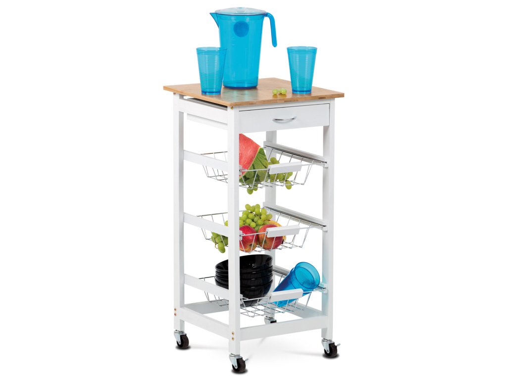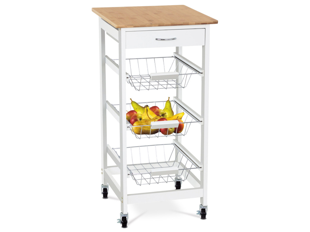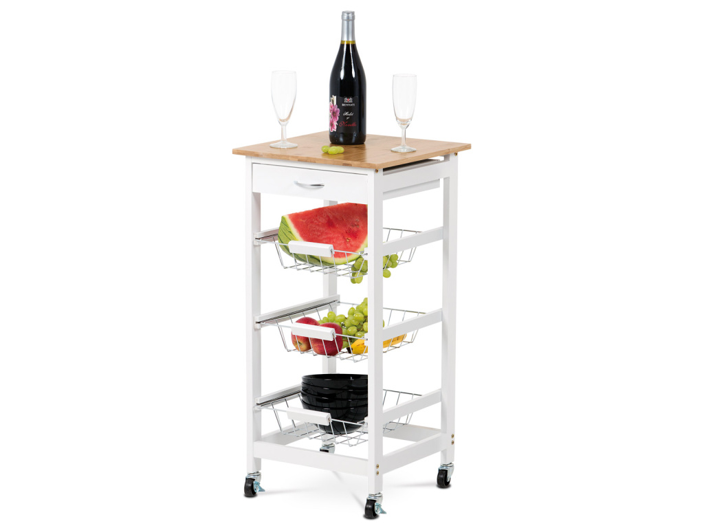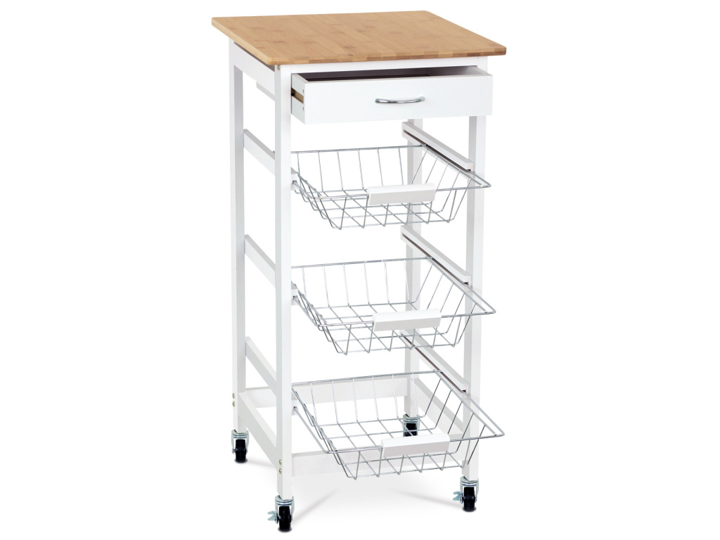 Servírovací stolek je šikovný a praktický doplněk do každé domácnosti. Plní funkci nejen při servírování, ale výborně slouží jako mobilní úložný prostor, a to nejen do kuchyně. Ve třech patrech s výsuvnými drátěnými koši s praktickou dřevěnou úchytkou, nabízí nepřeberné možnosti ukládání od ovoce až po nádobí či jiné kuchyňské potřeby. Deska je zhotovena z masivního bambusu v přírodním odstínu, opatřena silnou deskou odolného transparentního laku. Tím je zaručena eliminace poškození desky rozlitou tekutinou. Navíc bambus jako takový odpuzuje vodu. Krytý úložný prostor tvoří jedna menší zásuvka s chromovaným madlem. Zde je možné uložit příbory či drobné kuchyňské předměty, popř. jako skryté místo na sladkosti. Konstrukce vozíku je z lakovaných MDF přířezů v bílé matné barvě. Kolečka jsou plastová, obě přední jsou opatřeny brzdičkami. Koše jsou svařené z kovových drátů a chromované. Velikost bambusové desky je 37 x 37 cm, což je příjemné zvětšení kuchyňské plochy a navíc mobilní. Vozík svojí univerzálností, provedením a designovou čistou lze využít vlastně jakkoliv dle své fantazie. Jen mějte na paměti, že maximální nosnost vozíku je 15 kg.Doplňkové parametry