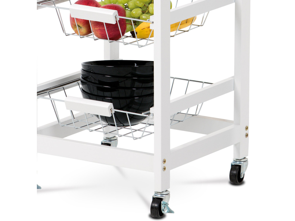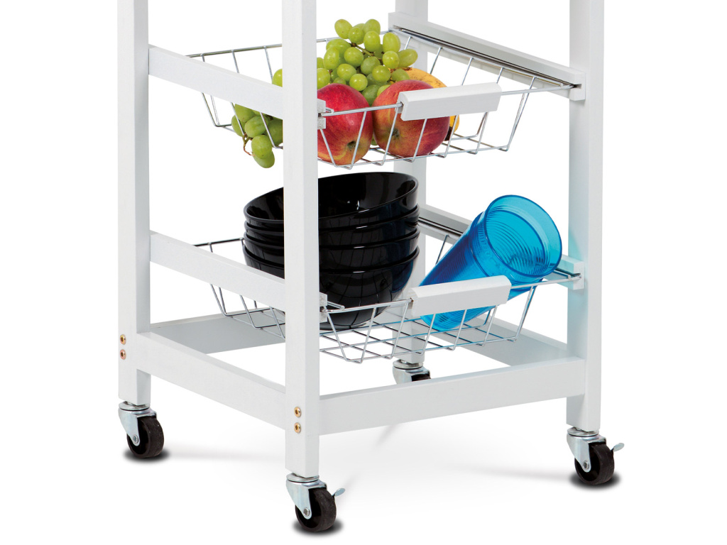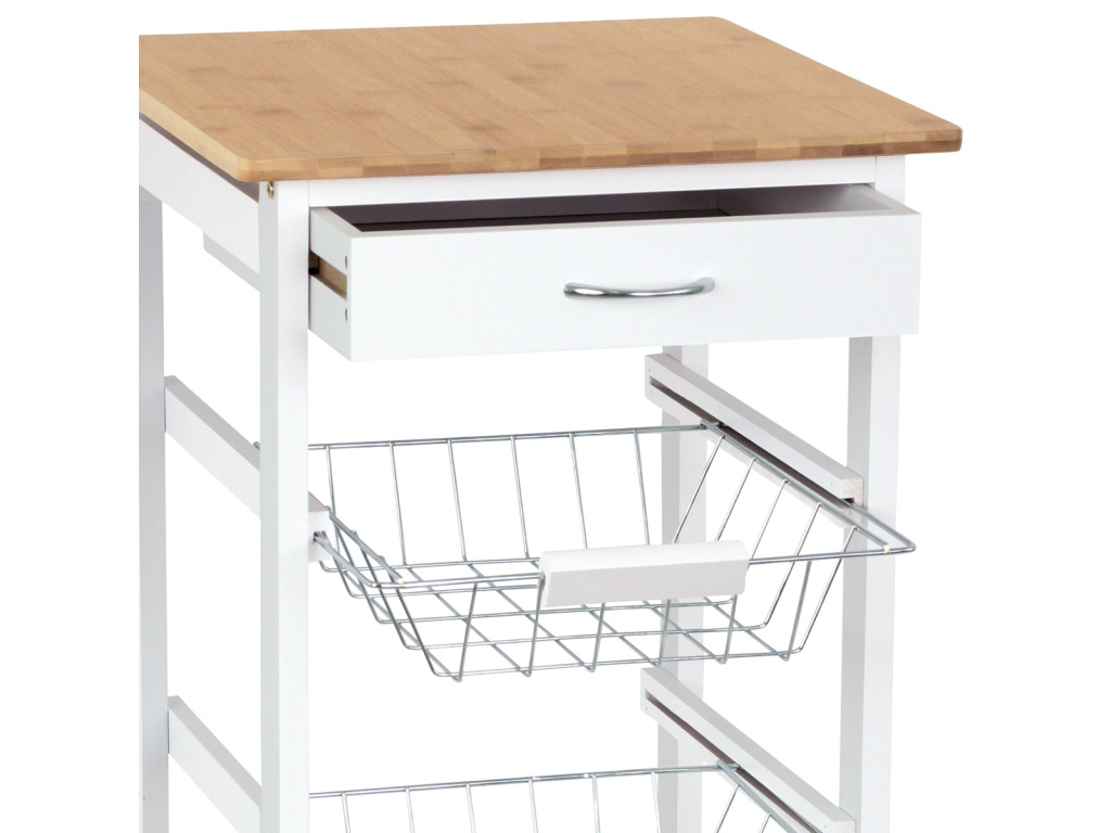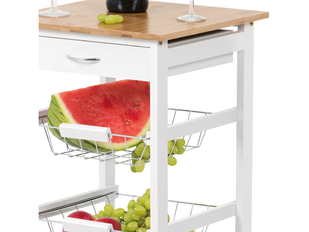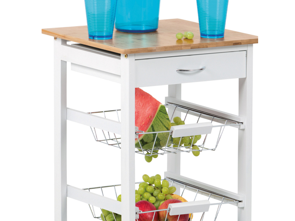 Servírovací stolek je šikovný a praktický doplněk do každé domácnosti. Plní funkci nejen při servírování, ale výborně slouží jako mobilní úložný prostor, a to nejen do kuchyně. Ve třech patrech s výsuvnými drátěnými koši s praktickou dřevěnou úchytkou, nabízí nepřeberné možnosti ukládání od ovoce až po nádobí či jiné kuchyňské potřeby. Deska je zhotovena z masivního bambusu v přírodním odstínu, opatřena silnou deskou odolného transparentního laku. Tím je zaručena eliminace poškození desky rozlitou tekutinou. Navíc bambus jako takový odpuzuje vodu. Krytý úložný prostor tvoří jedna menší zásuvka s chromovaným madlem. Zde je možné uložit příbory či drobné kuchyňské předměty, popř. jako skryté místo na sladkosti. Konstrukce vozíku je z lakovaných MDF přířezů v bílé matné barvě. Kolečka jsou plastová, obě přední jsou opatřeny brzdičkami. Koše jsou svařené z kovových drátů a chromované. Velikost bambusové desky je 37 x 37 cm, což je příjemné zvětšení kuchyňské plochy a navíc mobilní. Vozík svojí univerzálností, provedením a designovou čistou lze využít vlastně jakkoliv dle své fantazie. Jen mějte na paměti, že maximální nosnost vozíku je 15 kg.Doplňkové parametry