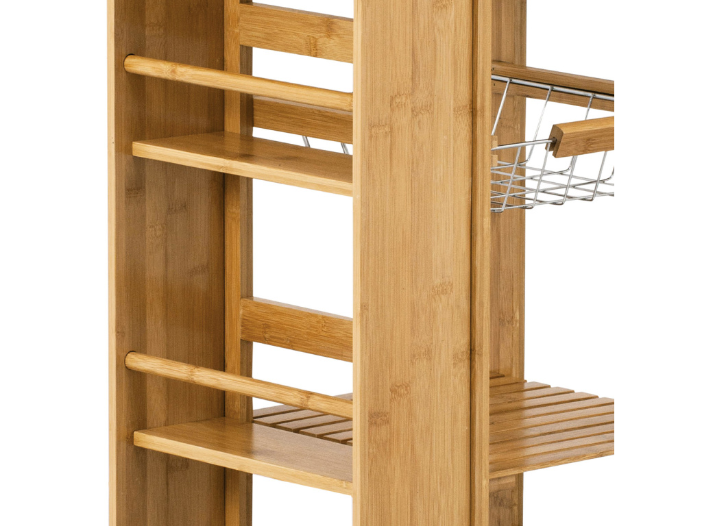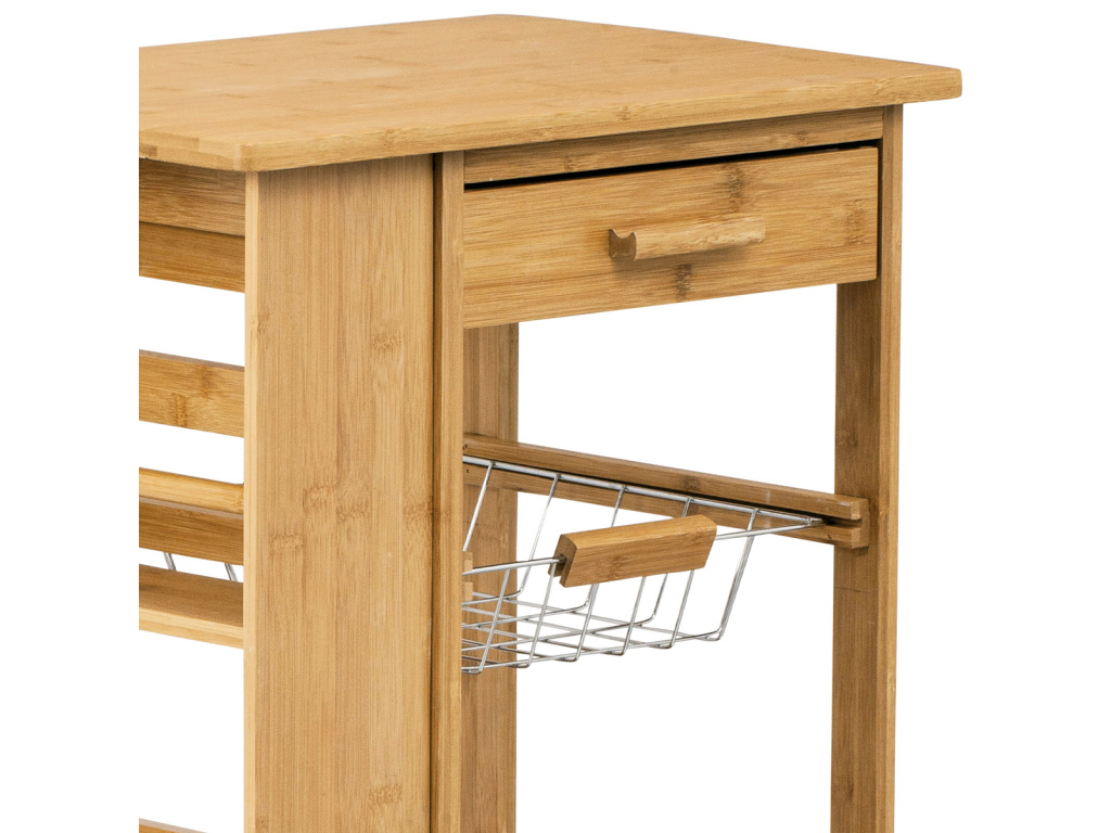 Servírovací stolek je šikovné a praktické doplnění do každé domácnosti. Plní funkci nejen při servírování, ale výborně slouží jako mobilní úložný prostor, a to nejen do kuchyně. Ve třech patrech nabízí variabilitu možností ukládání. Spodní a první patro tvoří pevné roštové poličky na možné uložení těžšího nádobí a nad nimi je výsuvný drátěný koš s praktickou dřevěnou úchytkou. Ten nabízí nepřeberné možnosti ukládání od ovoce až po nádobí či jiné kuchyňské potřeby. Deska i konstrukce je zhotovena z masivního štípaného bambusu v přírodním odstínu, opatřena silnou deskou odolného transparentního laku. Tím je zaručena eliminace poškození desky rozlitou tekutinou. Navíc bambus jako takový odpuzuje vodu. Krytý úložný prostor tvoří jedna menší zásuvka s dřevěným madlem. Zde je možné uložit příbory či drobné kuchyňské předměty, popř. jako skryté místo na sladkosti. Z jednoho boku má stolek 3 poličky na umístění lahví se zábranami proti vypadnutí a rozlití. Větší kolečka jsou plastová, obě přední jsou opatřeny brzdičkami. Koš je svařený z kovových drátů a chromovaný. Velikost bambusové desky je 50 x 37 cm, což je příjemné zvětšení kuchyňské plochy a navíc mobilní. Vozík svojí univerzálností, provedením a designovou čistou lze využít vlastně jakkoliv dle své fantazie. Jen mějte na paměti, že maximální nosnost vozíku je skvělých 20 kg.Doplňkové parametry