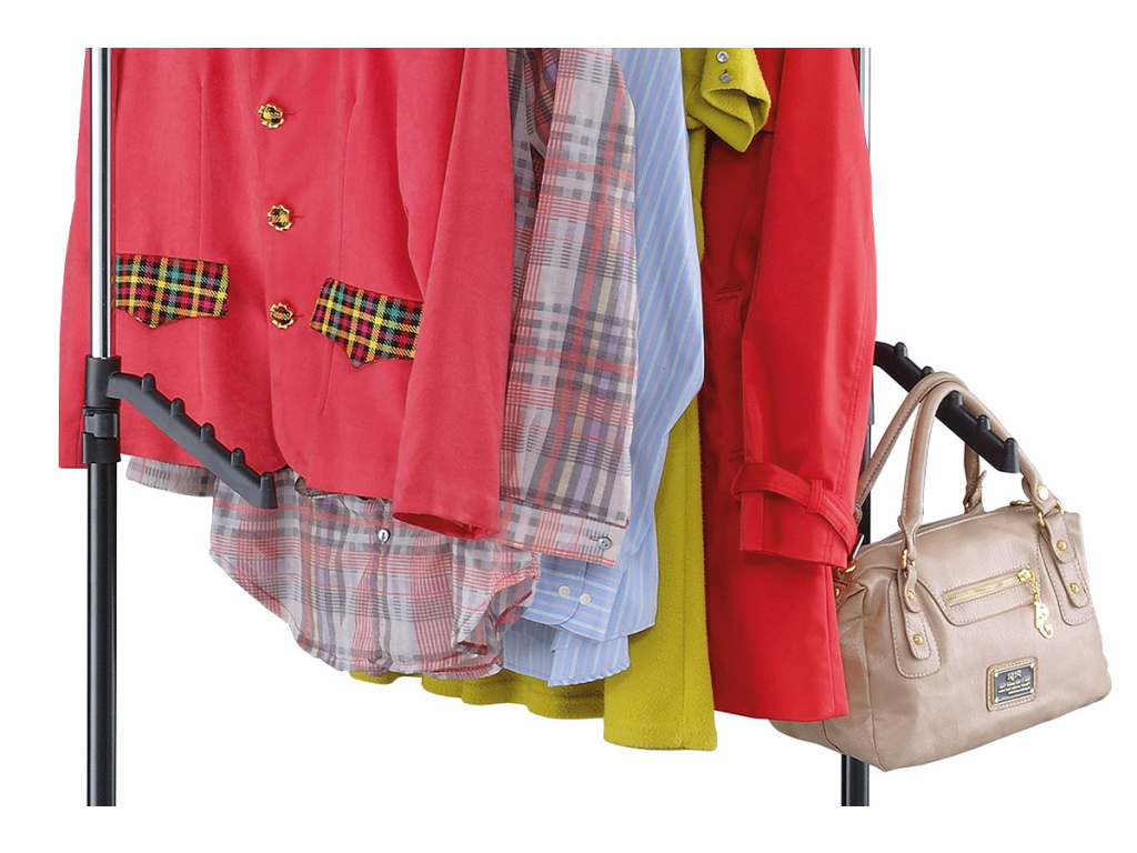 Stojan na šaty jednoramenný s pojezdem bez aretace v provedení chrom / černá barva kovu a plastu a praktickým odkladačem tvořeným dvěmi kovovými spojovacími trubkami a dvěmi závěsnými rameny určenými k zavěšení tašek, kabelek, kravat a podobných oděvních doplňků. Jsou otočné o 360°a umístěny na svislých nosných kovových tyčích. Doporučená nosnost je 5 kg rovnoměrně rozložené zátěže na jedno rameno. Stojan je určený do domácností a není určen pro zátěžový provoz. Výškově nastavitelný. Dodáváno v demontovaném stavu.Doplňkové parametry