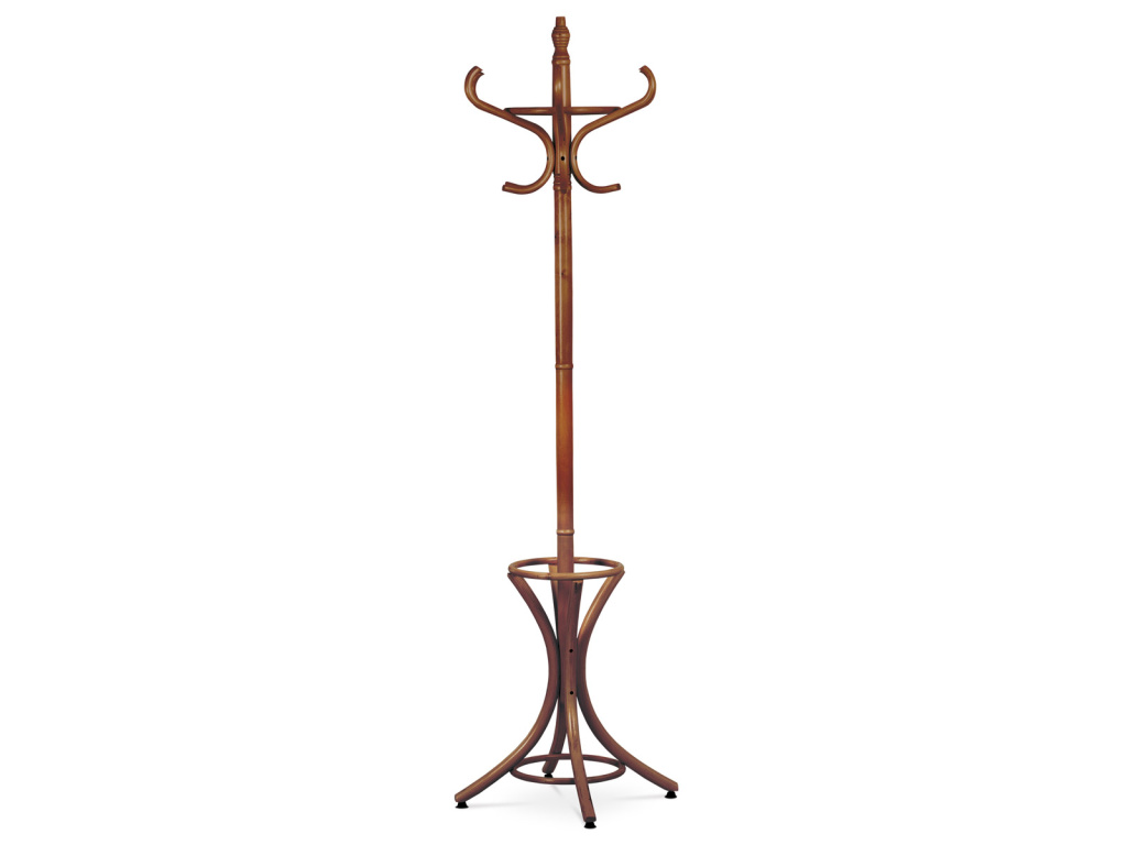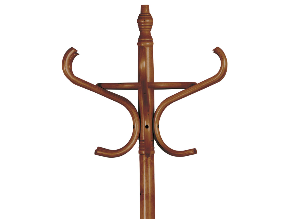 Dřevěný, volně stojící klasický věšák, resp. bestseller mezi věšáky. S jeho desingem se setkáváme již několik generací a jeho obliba je nadčasová. O tom svědčí i fakt, že ke svému původnímu účelu - a to věšení oblečení, začal sloužit i jako součást umění. Setkáváme se s ním např. v galeriích a výstavních prostorách, kde ho vidíme jako stojan na zavěšení obrazů nebo je dekorován živými či umělými květy nebo plastikami. Vyrobený je z ohýbaného topolového dřeva, nosná tyč je z břízy, mořený je v odstínu tmavý dub a lakovaný transparentním lakem. Výška 185 cm, nosnost je 12 kg rovnoměrné zátěže.Doplňkové parametry