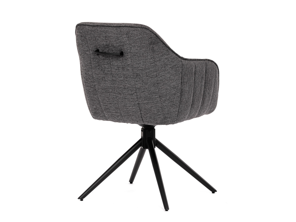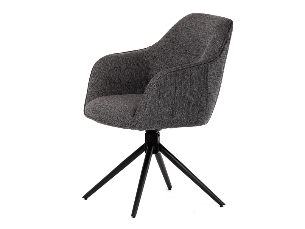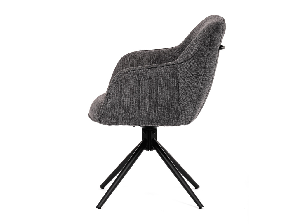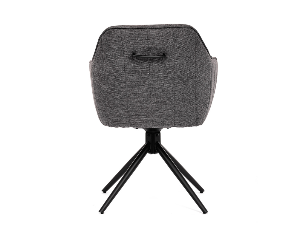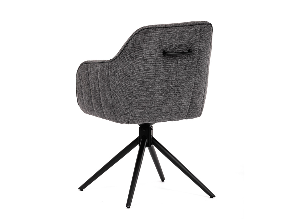 Moderní jídelní židle v šedé barvě s efektním prošitím zádové i přední části opěráku. Prošití je v brvě potahového materiálu. Zadní část opěráku je opatřena vkusným madlem pro snazší manipulaci. Čtyři kovové nohy v matném práškovém nástřiku vycházejí z centrálního bodu ve středu sedáku. Sedák je otočný o P90°+ L 90° s vratným mechanismem - funkce reset.Doplňkové parametry