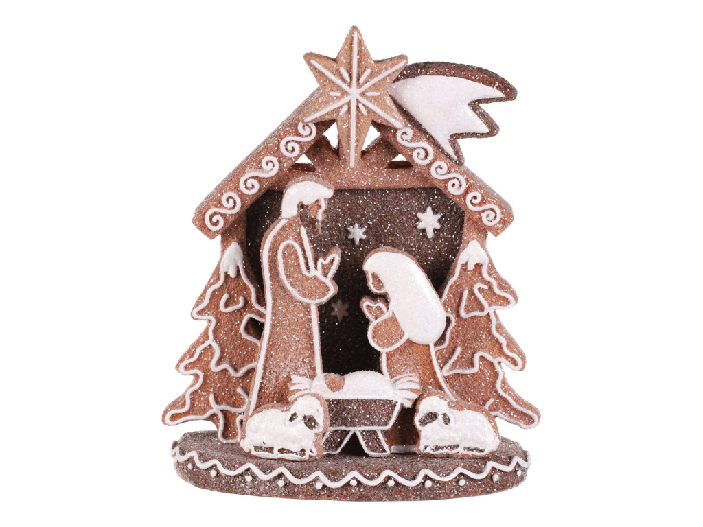 Betlém perníkový - polyresin, LED osvětl., hnědý s bílým zdobením - PES008