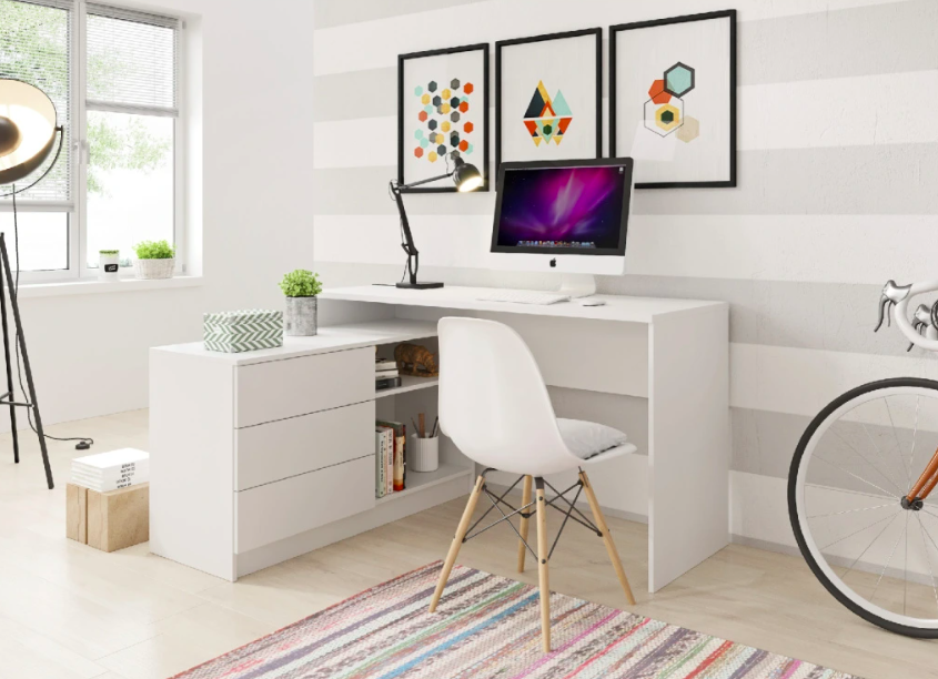 Rohový psací stůl, který opticky i fyzicky odděluje studijní část od té spací. Ideální řešení pro menší pokoje, kde bojujete s každým metrem.