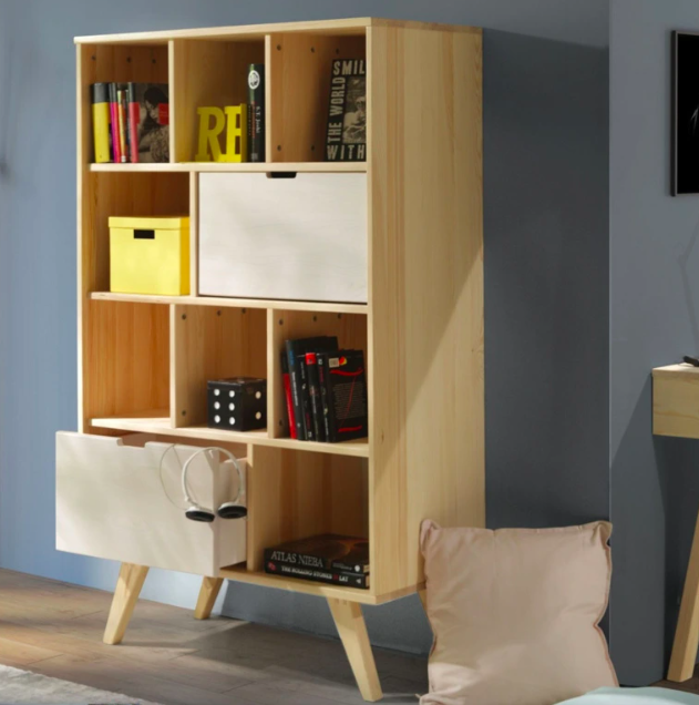 Otevřený regál postavený kolmo ke zdi. Vizuálně oddělí postel od zbytku pokoje a vytvoří tak pocit intimity, i když je pokoj společný se sourozencem.