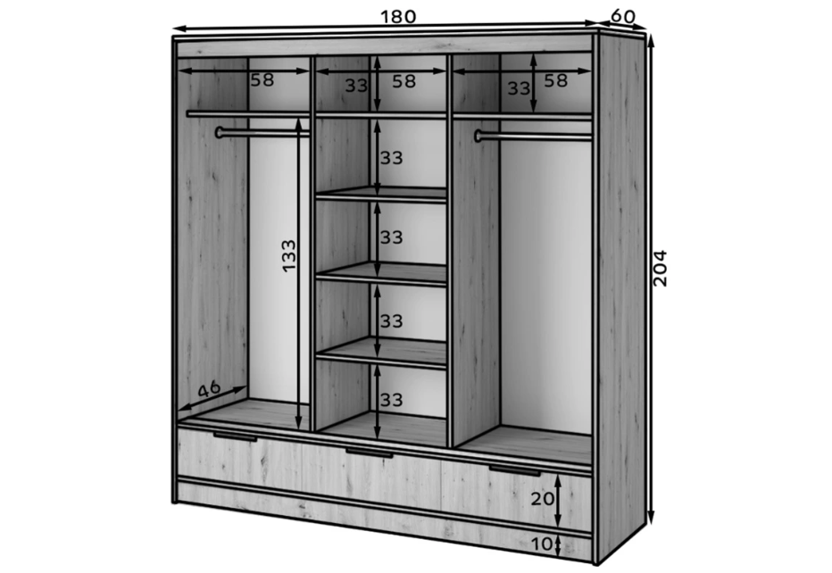 Myslete v zónách: dlouhé věšení (šaty/pláště), krátké věšení (košile/halenky), složené věci (police), prádlo a doplňky (zásuvky). Orientačně: rozteč polic 28–35 cm, zásuvky 12–20 cm na výšku, věšáková tyč cca 160–170 cm nad dno pro dlouhé věšení (nižší pro krátké).