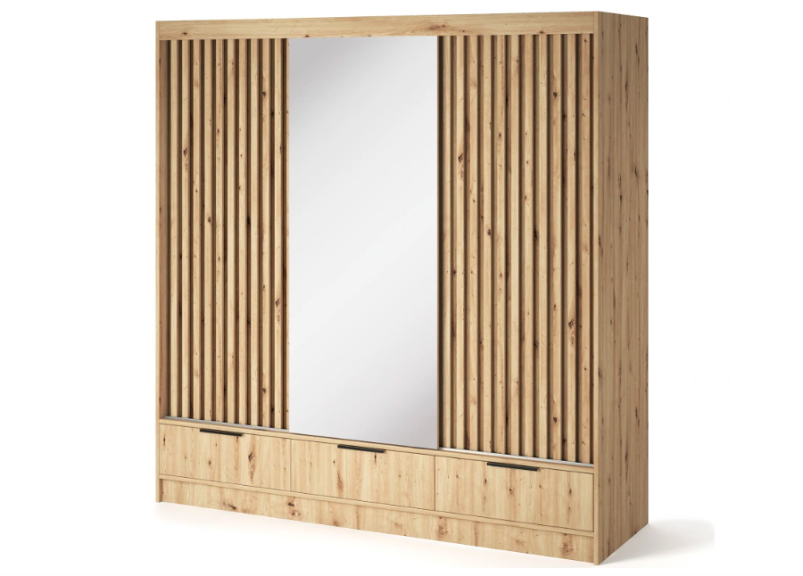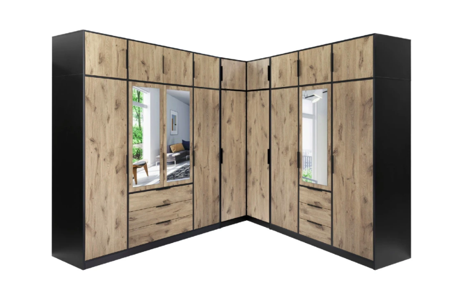 Ne každá místnost zvládne rovnou stěnu se skříní po celé délce. Do členitých dispozic a do koutů se hodí rohové skříně: dva navazující korpusy využijí prostor, který by jinak zůstal prázdný, a nabídnou velkorysé úložiště bez stavebních úprav. V úzkých pokojích fungují úzké skříně s promyšleným vnitřkem, které i při menší šířce nabídnou plnohodnotné věšení i skládání. Zrcadlové provedení se hodí tam, kde chcete skříň i zrcadlo, ale nechcete přidávat další solitér.
