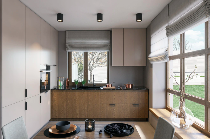 V malém prostoru je ideální volbou kompaktní kuchyňská linka s dostatečným úložným prostorem. Doporučuje se využít vertikální úložné prostory, například zavěšené skříňky až ke stropu. Prostor můžete opticky zvětšit lesklými povrchy a světlými barvami.