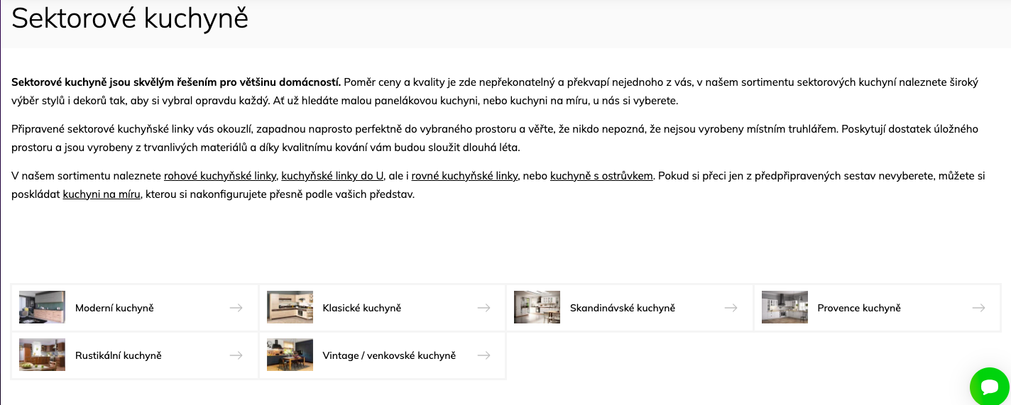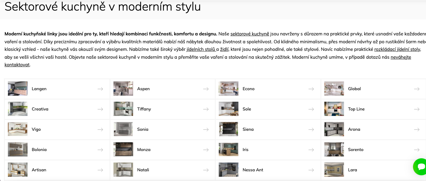 ➡️ Krok 1: Otevřít na e-shopu kategorii Sektorové kuchyně a vybrat si styl kuchyně (my pro ukázku vybíráme moderní kuchyně)