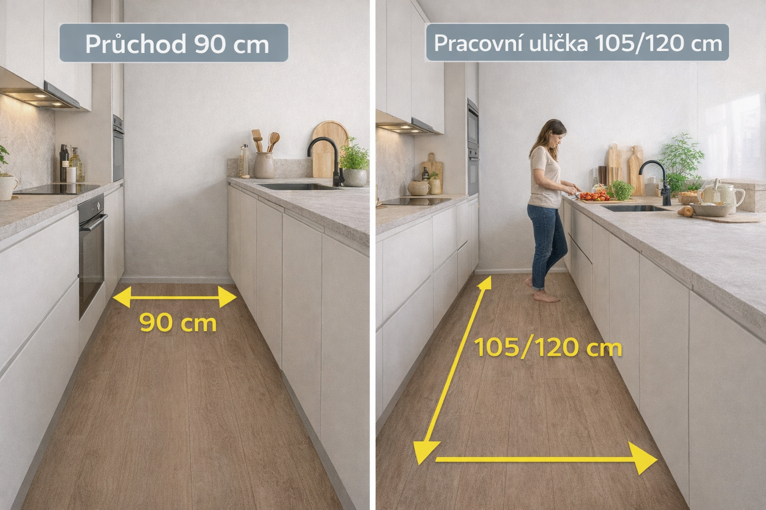 Pracovní ulička: min. 105 cm (1 kuchař) / 120 cm (víc kuchařů)