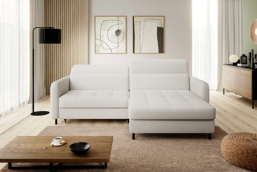Kompaktní rohová sedací souprava (kratší rameno ~140–160 cm) elegantně vyplní kout.