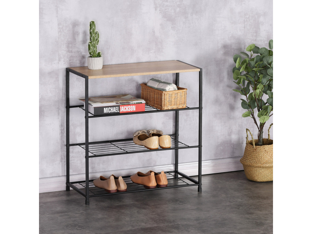 Botník s konstrukcí a odkládacími plochami z lehkého kovu v černé barvě. Půda je vyrobena z MDF desky s povrchovou úpravou 3D folie v odstínu dub sonoma.Doplňkové parametry