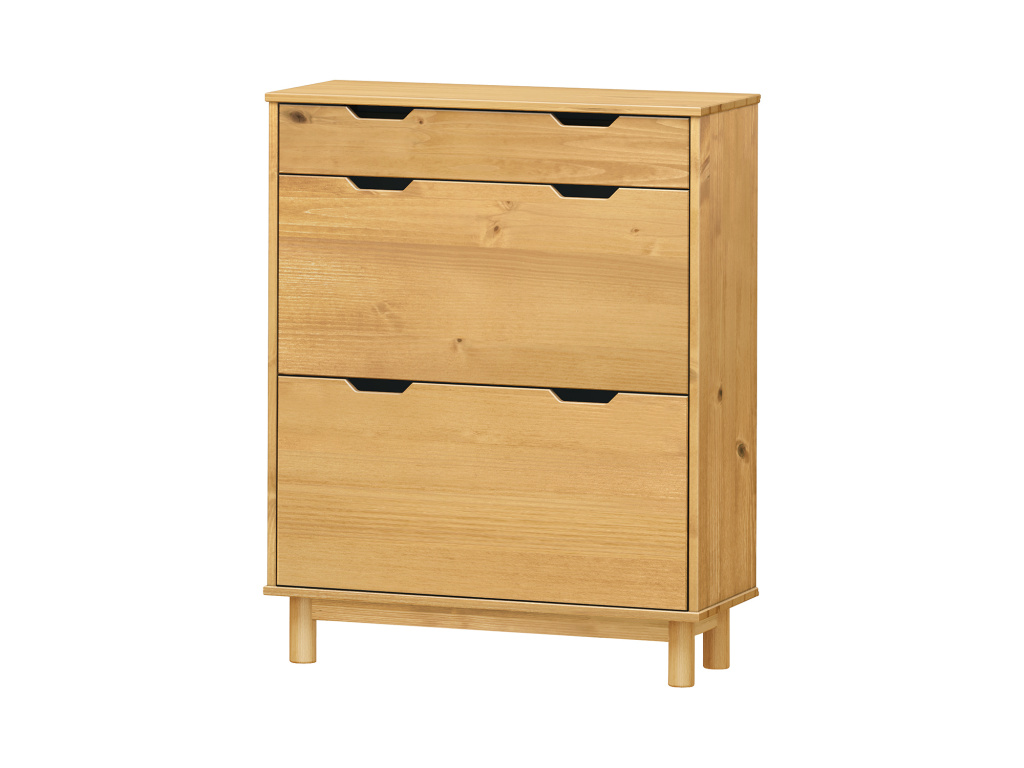 Botník BONITO 2 z masivní borovice ošetřený voskem v krásném medovém odstínu dodá předsíni přírodní teplo a nadčasovou eleganci – nabízí praktickou zásuvku s kvalitními kovovými pojezdy a dva dvouřadé výklopy, které zajistí přehledné a úsporné uložení obuvi, zatímco voskovaná úprava zvýrazňuje strukturu dřeva a zajišťuje jeho dlouhou životnost.