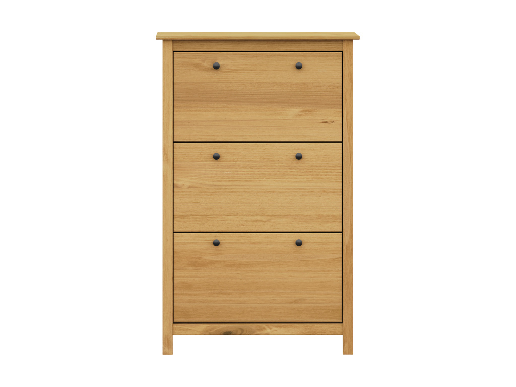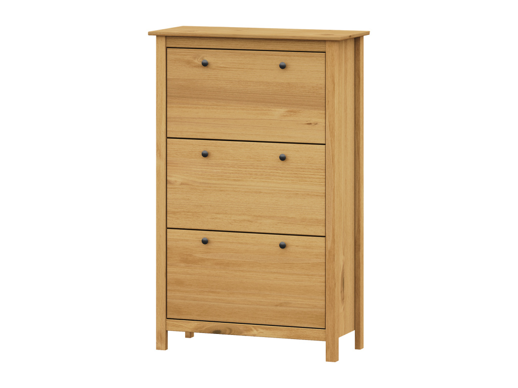 Stylový botník TORINO z masivní borovice vyniká svým přírodním vzhledem a poctivým řemeslným zpracováním. Povrch je ošetřen kvalitním voskem v teplém medovém odstínu, který zvýrazňuje kresbu dřeva a dodává nábytku útulný charakter. Elegantní kovové úchytky v provedení černěná mosaz podtrhují rustikální i moderní styl interiéru. Praktické tři dvouřadé výklopy poskytují dostatek prostoru pro přehledné uložení obuvi a udržení pořádku v předsíni. Botník TORINO spojuje funkčnost, odolnost a nadčasový design, který se skvěle hodí do každého domova.