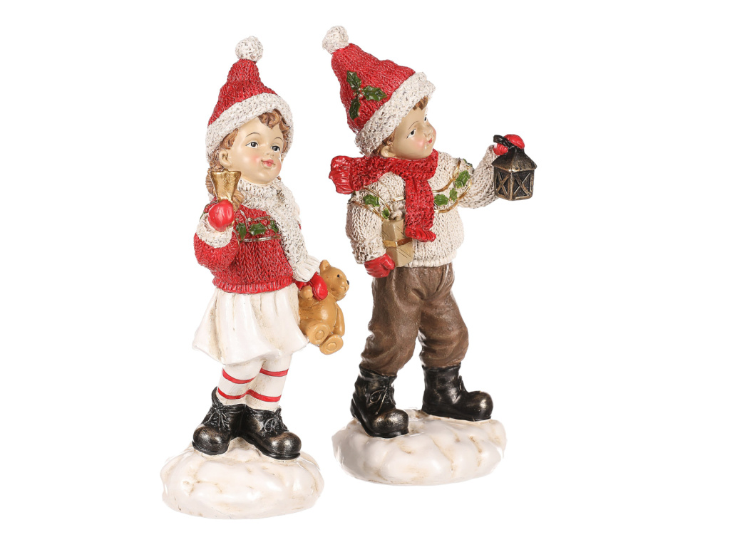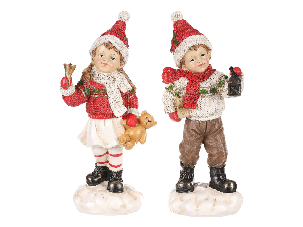 Přidejte do svých vánočních aranží tuto krásnou dekorační figurku, která je k dostání v mixu dvou druhů, a to buď chlapce s dárkem anebo dívky s medvídkem. Oba jsou zimně oblečeni, mají červenou čepičku a jsou z keramiky. Vypadají, jako by se zrovna vrátili ze zimní procházky. S teplým pleteným svetrem, šálou a dalšími ozdobnými doplňky, jsou nejen neodolatelnými vánočními postavičkami, ale také nádhernými ozdobami na stůl, poličku či do vitríny. Figurka dívky či chlapce svým veselým provedením přináší do prostoru hravost a nefalšovanou dětskou radost.Doplňkové parametry