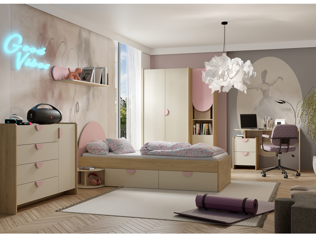 Dětská postel LEXI 13 nabízí pohodlné a praktické řešení pro dětský pokoj. Postel je vybavena úložným prostorem v podobě dvou zásuvek, které poskytují dostatek místa pro uložení ložního prádla, hraček nebo dalších potřeb a pomáhají tak udržet v pokoji pořádek. Postel je k dispozici v levém i pravém provedení, což umožňuje snadné přizpůsobení dispozici pokoje a individuálním potřebám uspořádání interiéru. Design je laděn do kombinace dekoru dub Cremona a odstínu makadamie, doplněného o jemný barevný prvek v pudrově růžové nebo mořské modré, který dodává nábytku moderní a hravý vzhled vhodný do dětského interiéru. Postel je dodávána bez matrace, tu je možné doobjednat zde. Postel je součástí sektorového systému LEXI, který umožňuje vzájemně kombinovat jednotlivé moduly a vytvořit dětský pokoj přesně podle potřeb a prostorových možností.