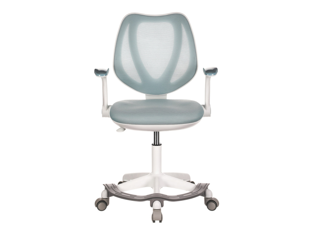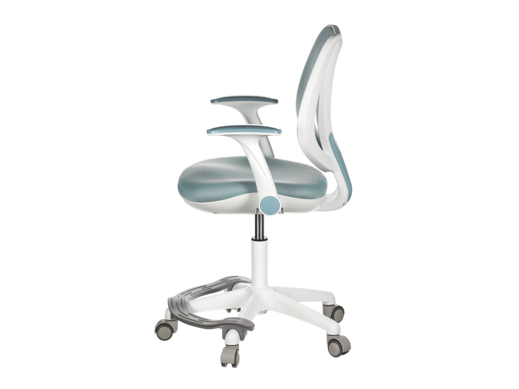 Dětská židle v příjemných pastelových barvách spolu s bílou kostrou nabízí jednoduchý a elegantní design. Židle má pevný opěrák potažený prodyšným síťovaným materiálem. Sedák ve stejném potahu poskytuje dostatek pohodlí díky svému vyměkčení. Pro pocit pohodlí slouží pevné područky, které jsou na své vrchní části opatřeny lesklým plastovým povrchem v barvě potahového materiálu. Důležitá je také integrovaná opěra nohou, která přispívá k pohodlnému sezení. Židle je opatřena speciálními funkčními kolečky, která se při zatížení automaticky zablokují, což zabraňuje nechtěným pohybům židle.Doplňkové parametry