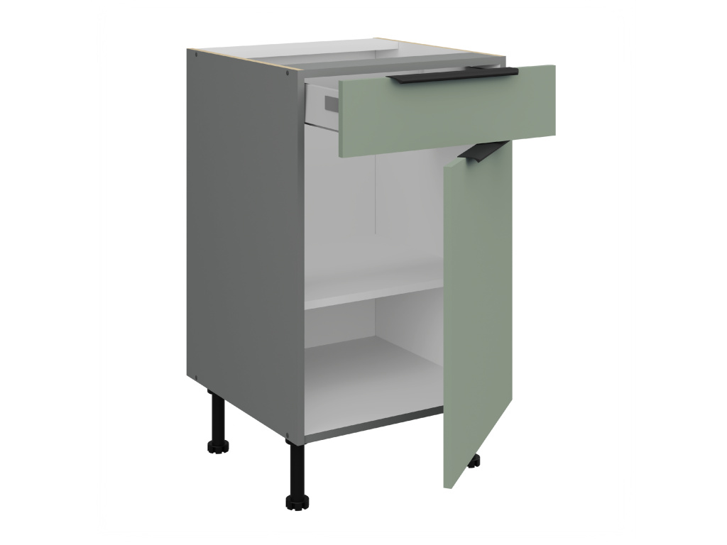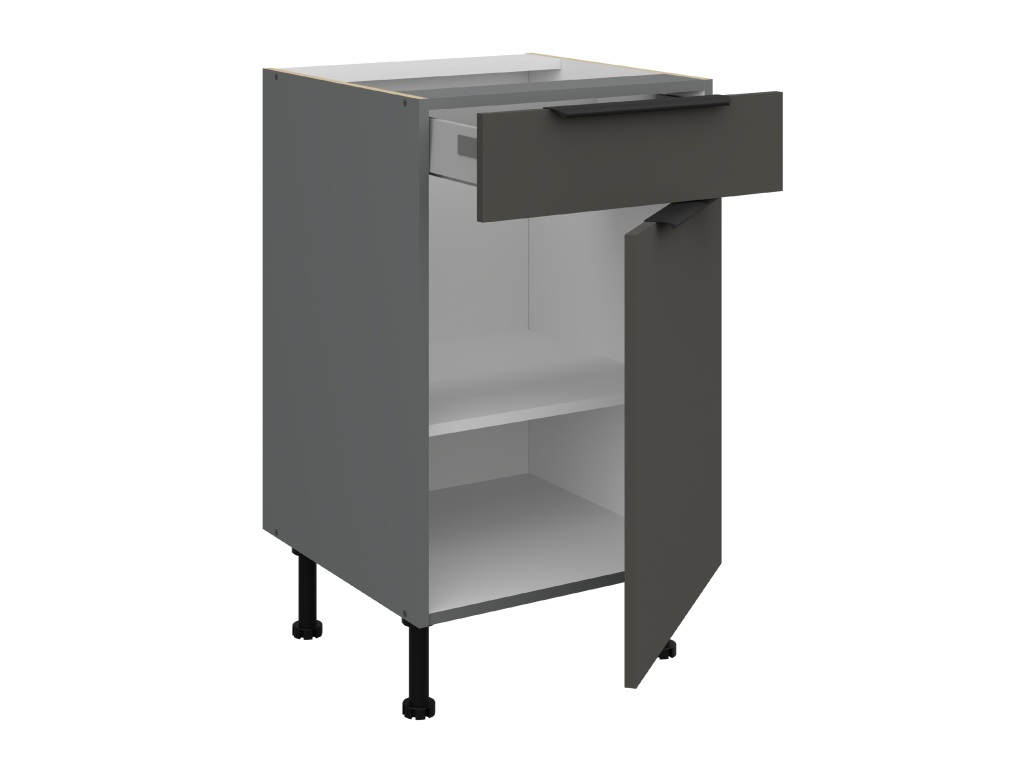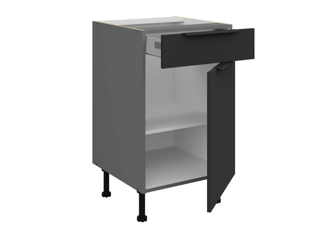 Spodní skříňka Aria ANT 50 D 1F 1S BB PREMIUM BOX kombinuje jednu prostornou zásuvku a jedny dvířka, které poskytují praktický úložný prostor pro kuchyňské náčiní i potřeby na vaření. Sektorová kuchyň Aria ANT představuje moderní spojení minimalistického designu a praktičnosti. Antracitový korpus dodává kuchyni výrazný a nadčasový charakter, zatímco hladká dvířka s technologií Anti-Fingerprint jsou dostupná v pěti elegantních odstínech: černá, akvamarín, sandgrau, grafit a crystal white. Součástí skříněk je kvalitní kování s tichým dovíráním, zásuvky PREMIUM BOX a černé kovové úchytky. Skříňky jsou variabilní, s univerzálním otevíráním dvířek (levé/pravé) a nastavitelnými nožičkami pro snadné vyrovnání.