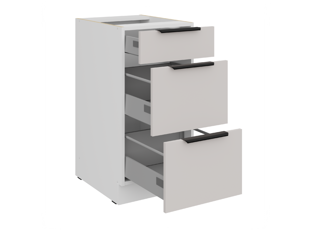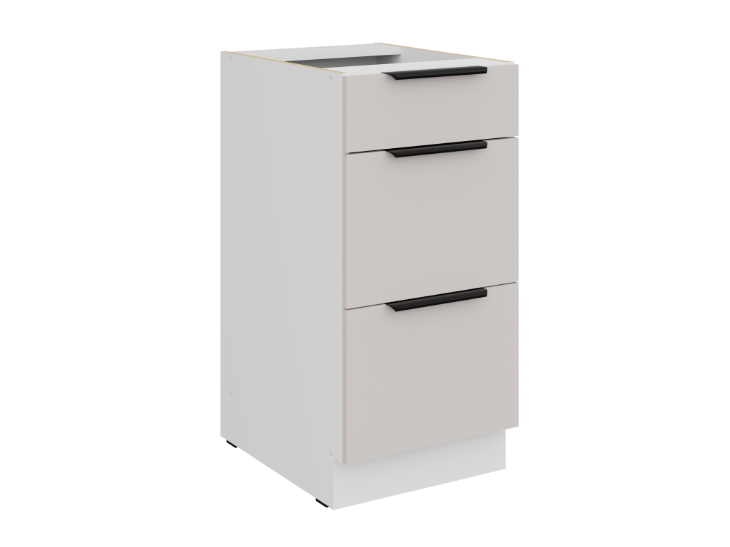 Dolní skříňka COMO 40 D 3S BB PREMIUM BOX nabízí tři zásuvky v kompaktním provedení, ideální pro přehledné uspořádání menších kuchyňských potřeb v moderním kašmírovém designu s tichým a komfortním dovíráním. Kuchyně COMO představuje harmonické spojení kašmírových dvířek s čistě bílým korpusem a moderně laděným designem. Světlé provedení dodává prostoru vzdušnost a pocit lehkosti, zatímco propracované detaily podtrhují minimalistický a nadčasový charakter celé sestavy. Korpus i dvířka z kvalitní laminované desky zajišťují dlouhou životnost a snadnou údržbu. Design doplňují elegantní černé hliníkové úchytky, zásuvky s hladkým chodem typu Premium Box a dvířka vybavená systémem tichého dovírání pro maximální komfort při každodenním používání.