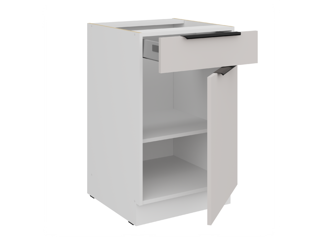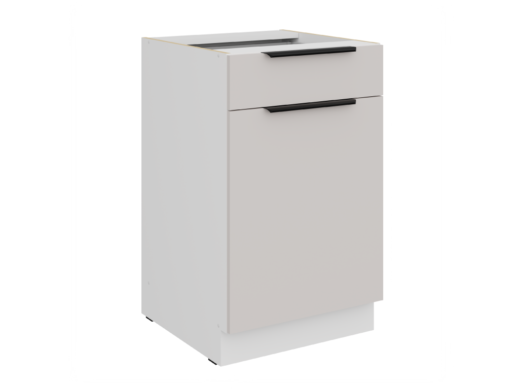 Dolní skříňka COMO 50 D 1F 1S BB PREMIUM BOX kombinuje dvířkovou část a zásuvku, což umožňuje praktické a přehledné uložení kuchyňských věcí v moderním kašmírovém designu s tichým a komfortním dovíráním. Kuchyně COMO představuje harmonické spojení kašmírových dvířek s čistě bílým korpusem a moderně laděným designem. Světlé provedení dodává prostoru vzdušnost a pocit lehkosti, zatímco propracované detaily podtrhují minimalistický a nadčasový charakter celé sestavy. Korpus i dvířka z kvalitní laminované desky zajišťují dlouhou životnost a snadnou údržbu. Design doplňují elegantní černé hliníkové úchytky, zásuvky s hladkým chodem typu Premium Box a dvířka vybavená systémem tichého dovírání pro maximální komfort při každodenním používání.