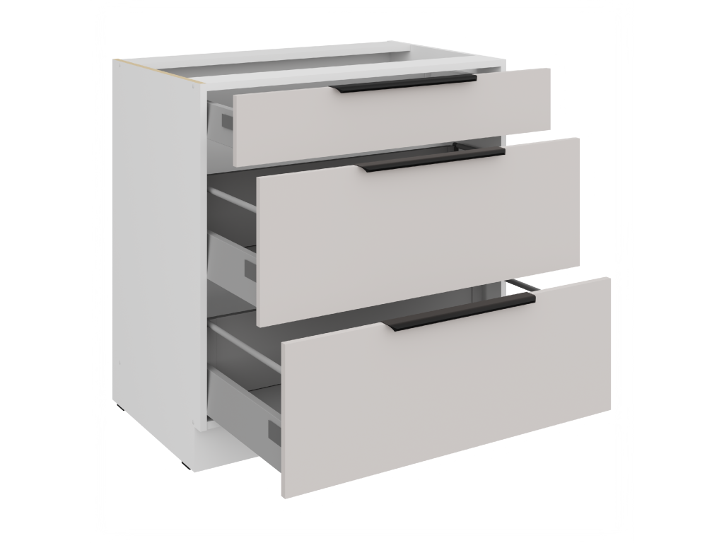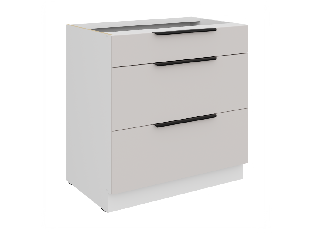 Dolní skříňka COMO 80 D 3S BB PREMIUM BOX se třemi zásuvkami nabízí praktický a přehledný úložný prostor v moderním kašmírovém designu s důrazem na komfortní a tiché dovírání. Kuchyně COMO představuje harmonické spojení kašmírových dvířek s čistě bílým korpusem a moderně laděným designem. Světlé provedení dodává prostoru vzdušnost a pocit lehkosti, zatímco propracované detaily podtrhují minimalistický a nadčasový charakter celé sestavy. Korpus i dvířka z kvalitní laminované desky zajišťují dlouhou životnost a snadnou údržbu. Design doplňují elegantní černé hliníkové úchytky, zásuvky s hladkým chodem typu Premium Box a dvířka vybavená systémem tichého dovírání pro maximální komfort při každodenním používání.
