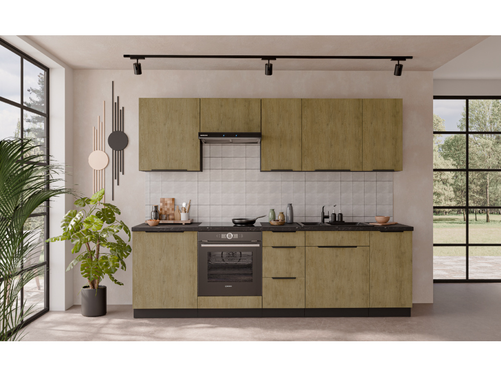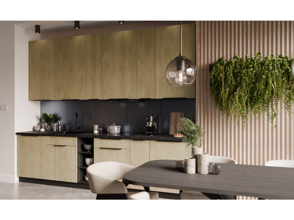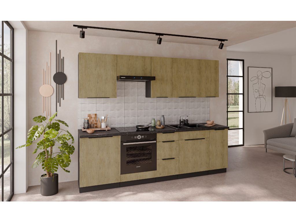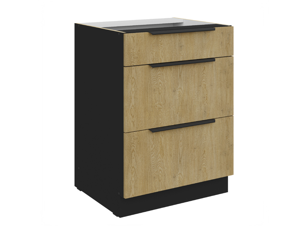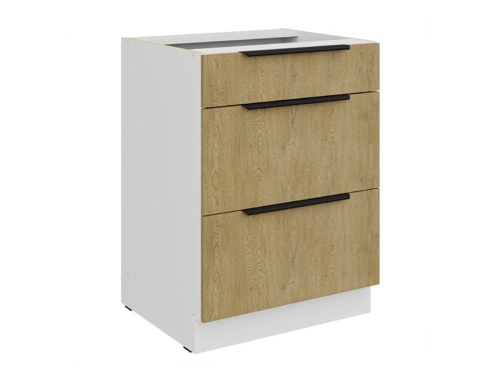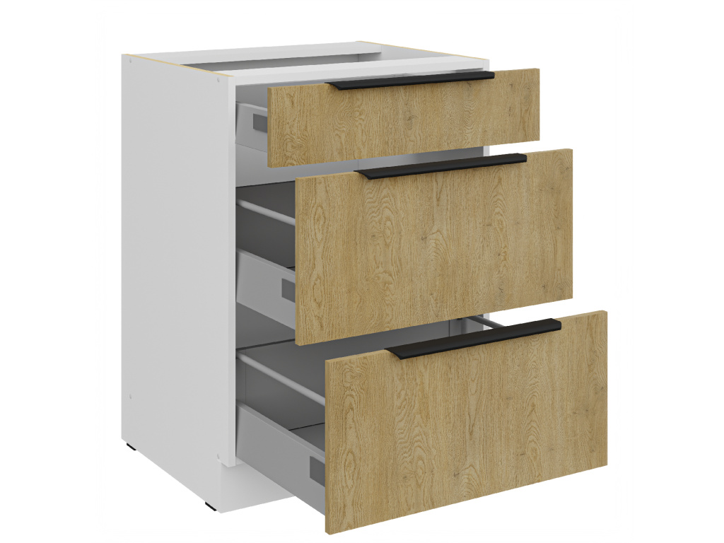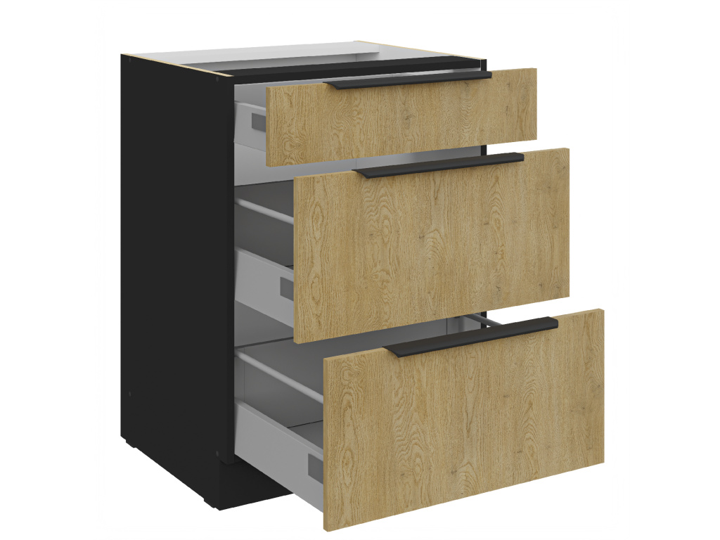 Dolní kuchyňská skříňka z kolekce CREMONA nabízí tři prostorné zásuvky s prémiovým systémem PREMIUM BOX, který zajišťuje plnovýsuv a tiché dovírání pro maximální pohodlí při používání. Korpus je vyroben z 16 mm laminované desky, dostupné v černé nebo bílé barvě, zadní část tvoří 2,5 mm HDF deska v bílé barvě. Čela zásuvek jsou z 16 mm laminované desky v dekoru dub Cremona, který dodává nábytku přírodní a moderní vzhled. Skříňka je doplněna černými hliníkovými úchytkami UA-HEXA s hranou s roztečí od 64 mm do 320 mm, což zajišťuje pohodlné otevírání. Díky třem zásuvkám je tento model ideální pro organizaci kuchyňských potřeb a příborů v elegantním designu.