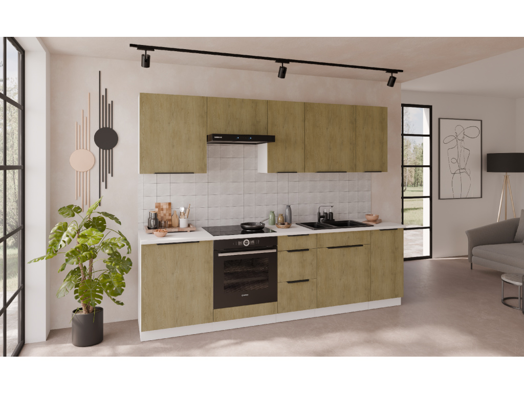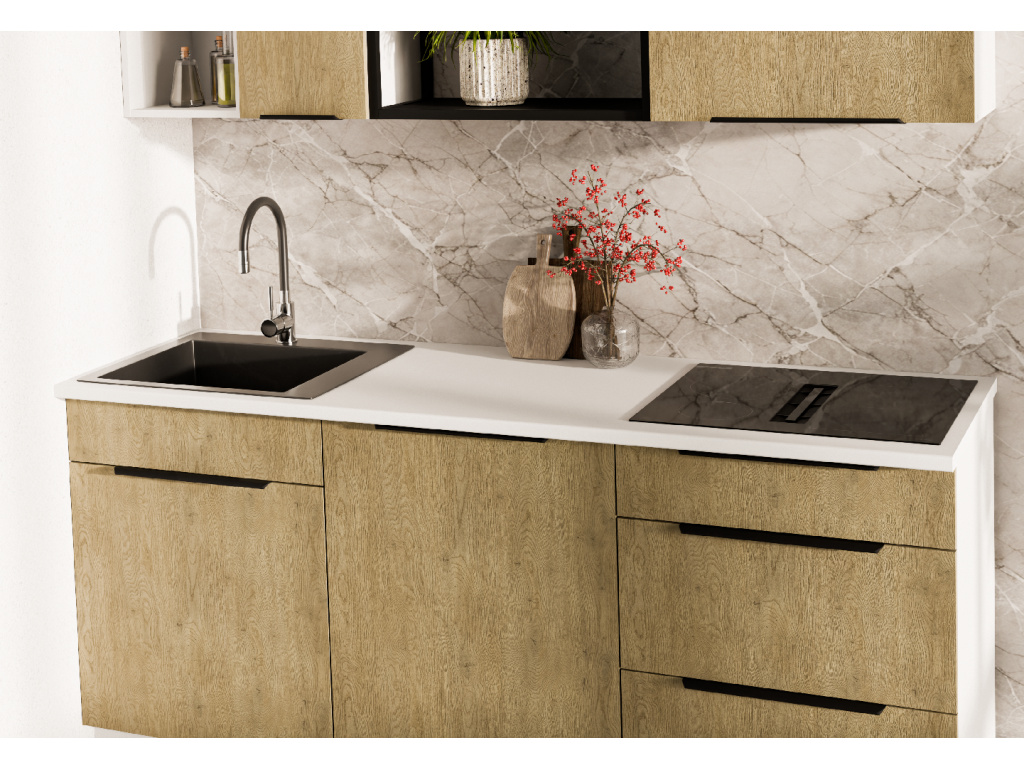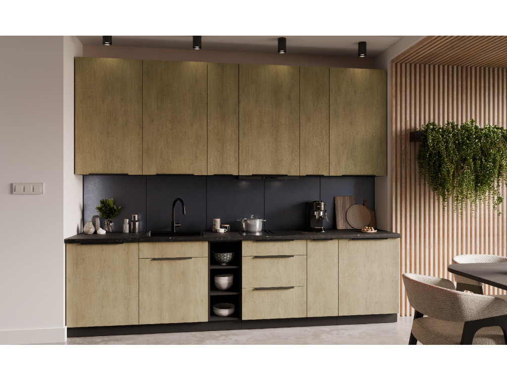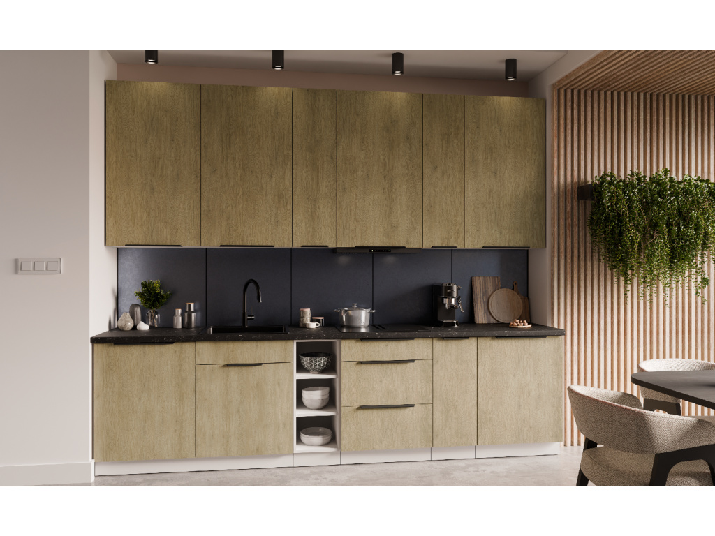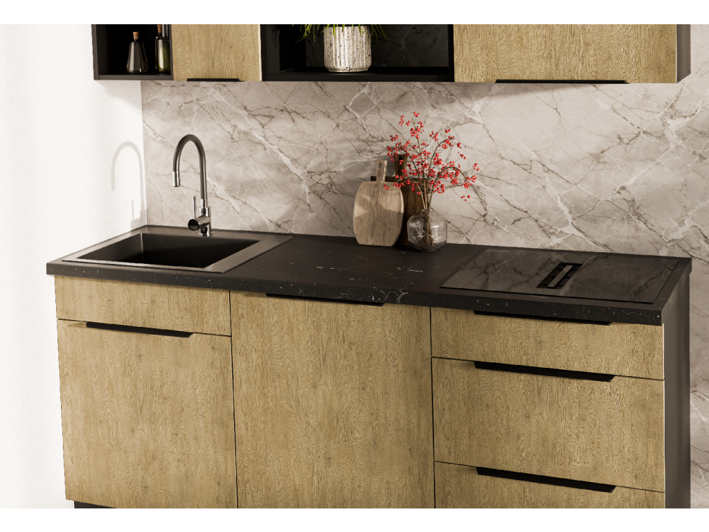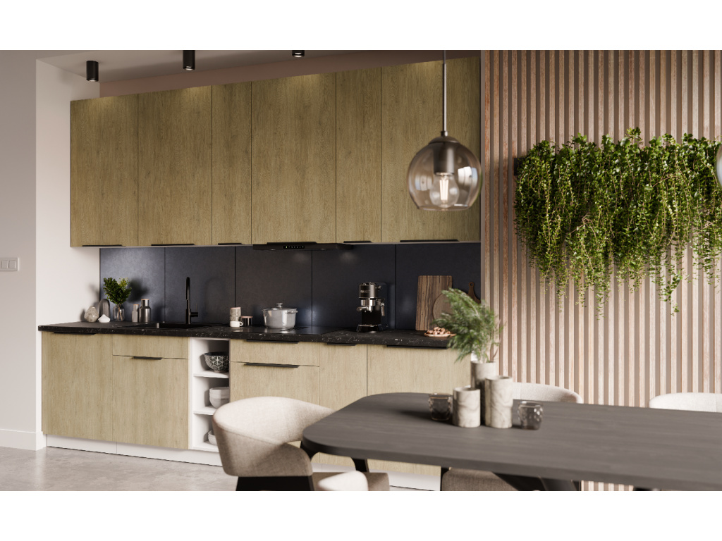 Dolní kuchyňská skříňka z kolekce CREMONA nabízí tři prostorné zásuvky s prémiovým systémem PREMIUM BOX, který zajišťuje plnovýsuv a tiché dovírání pro maximální pohodlí při používání. Korpus je vyroben z 16 mm laminované desky, dostupné v černé nebo bílé barvě, zadní část tvoří 2,5 mm HDF deska v bílé barvě. Čela zásuvek jsou z 16 mm laminované desky v dekoru dub Cremona, který dodává nábytku přírodní a moderní vzhled. Skříňka je doplněna černými hliníkovými úchytkami UA-HEXA s hranou s roztečí od 64 mm do 320 mm, což zajišťuje pohodlné otevírání. Díky třem zásuvkám je tento model ideální pro organizaci kuchyňských potřeb a příborů v elegantním designu.