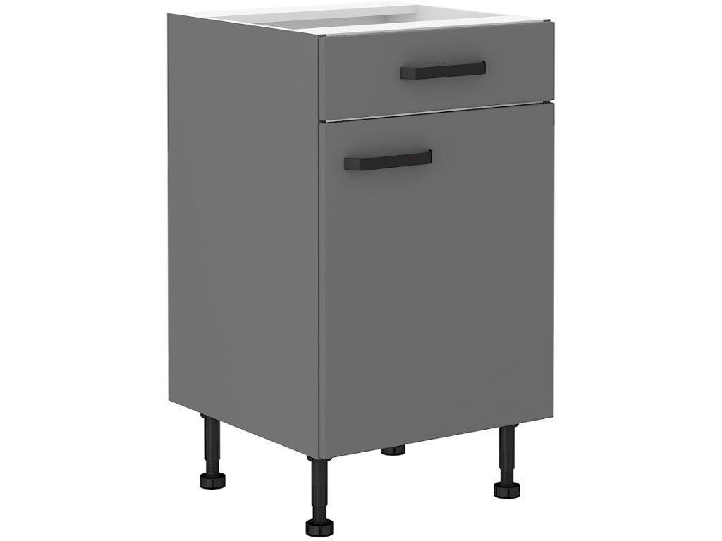 Dolní kuchyňská skříňka NESSA ANT o šířce 50 cm kombinuje praktickou zásuvku a úložný prostor za dvířky, což z ní činí univerzální a funkční prvek moderní kuchyně. Korpus je vyroben z odolné laminované desky o tloušťce 16 mm v elegantním antracitovém dekoru, doplněn o pevné ABS hrany a melaminový povrch pro snadnou údržbu a dlouhou životnost. Zásuvka je vybavena systémem PREMIUM BOX pro plynulý a tichý chod, zatímco čelo dvířek je opatřeno tlumeným zavíráním. Kovová úchytka s roztečí 160 mm dodává skříňce moderní vzhled. Výškově nastavitelné nožičky umožňují přizpůsobení výšce pracovní plochy i nerovnostem podlahy. Skříňka je dodávána bez soklu (k dispozici samostatně) a v balení naleznete kompletní korpus připravený k montáži. NESSA ANT je skvělým spojením elegance a praktičnosti.