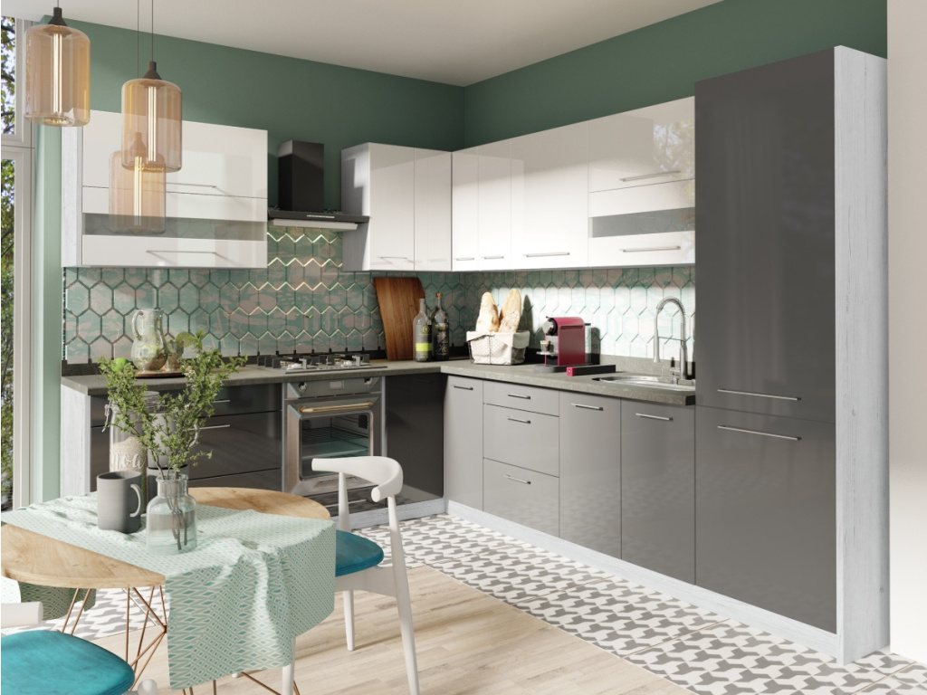 Rohové skřínky kuchyně Creativa15D jsou vyrobeny z vysoce kvalitního materiálu, konkrétně z laminátových desek, známých též jako LTD, a MDF. Tento materiál je zárukou vysoké pevnosti, stability a odolnosti proti různým formám poškození po mnoho let své životnosti. Celkový dojem produktu je dále umocněn díky vysoce lesklému dekoru čelních ploch, který je dostupný v elegantní bílé nebo sofistikované šedé barvě.