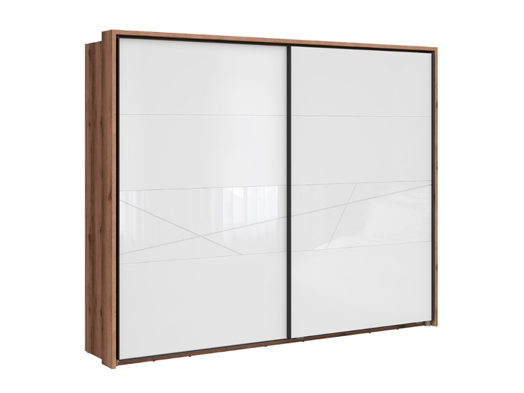 Barevné provedení skříně FORN je skvostně elegantní. Dub delano tmavý a bílý lesk vytvářejí kontrastní kombinaci, která okamžitě přitáhne pozornost. Dveře skříně jsou potaženy PVC fólií s vkusnými frézovanými vzory, což dodává skříni jedinečný vzhled.