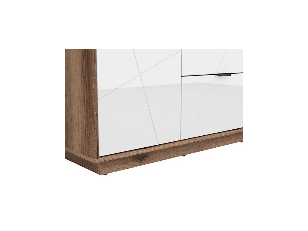 Šatní skříň FORN se vyznačuje nenápadnými, kovovými úchytkami černé barvy, které dodávají celému kusu nábytku sofistikovaný vzhled. Barevné provedení ve dřevě dub delano tmavý s bílým leskem je moderní a luxusní, což udělá váš obývací pokoj nejenom dobře organizovaným, ale také nádherně stylovým.
