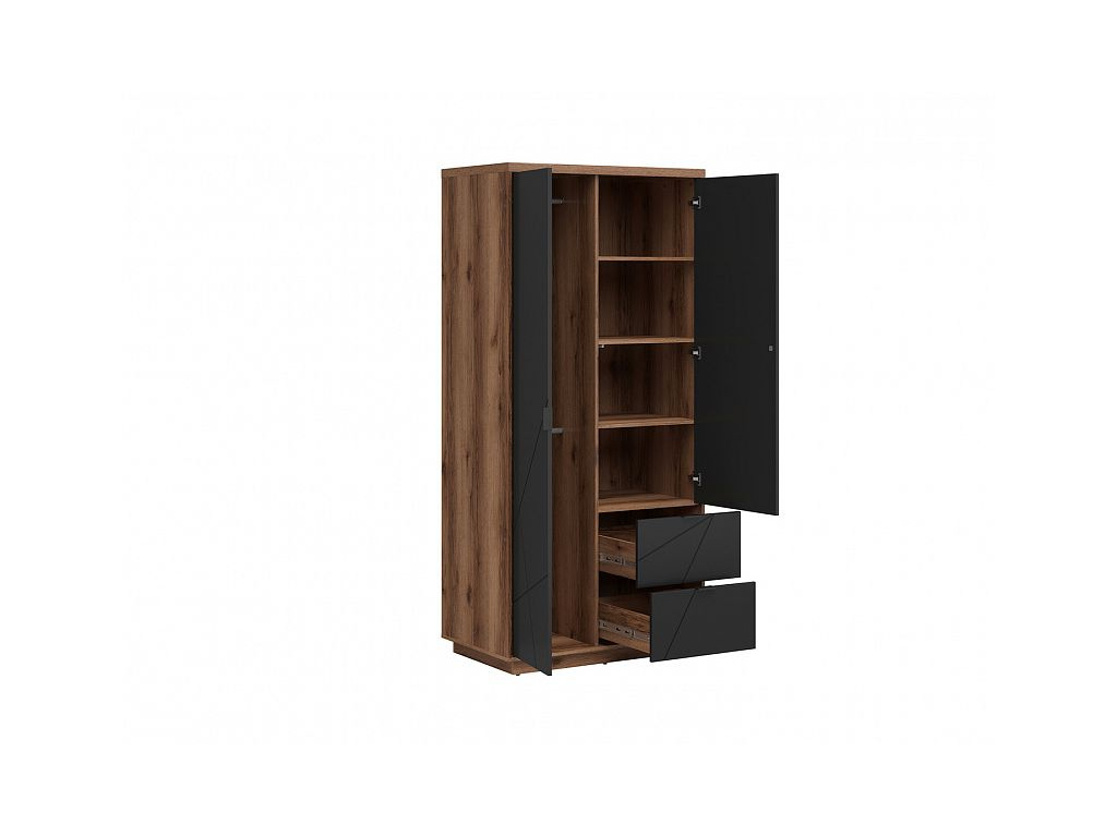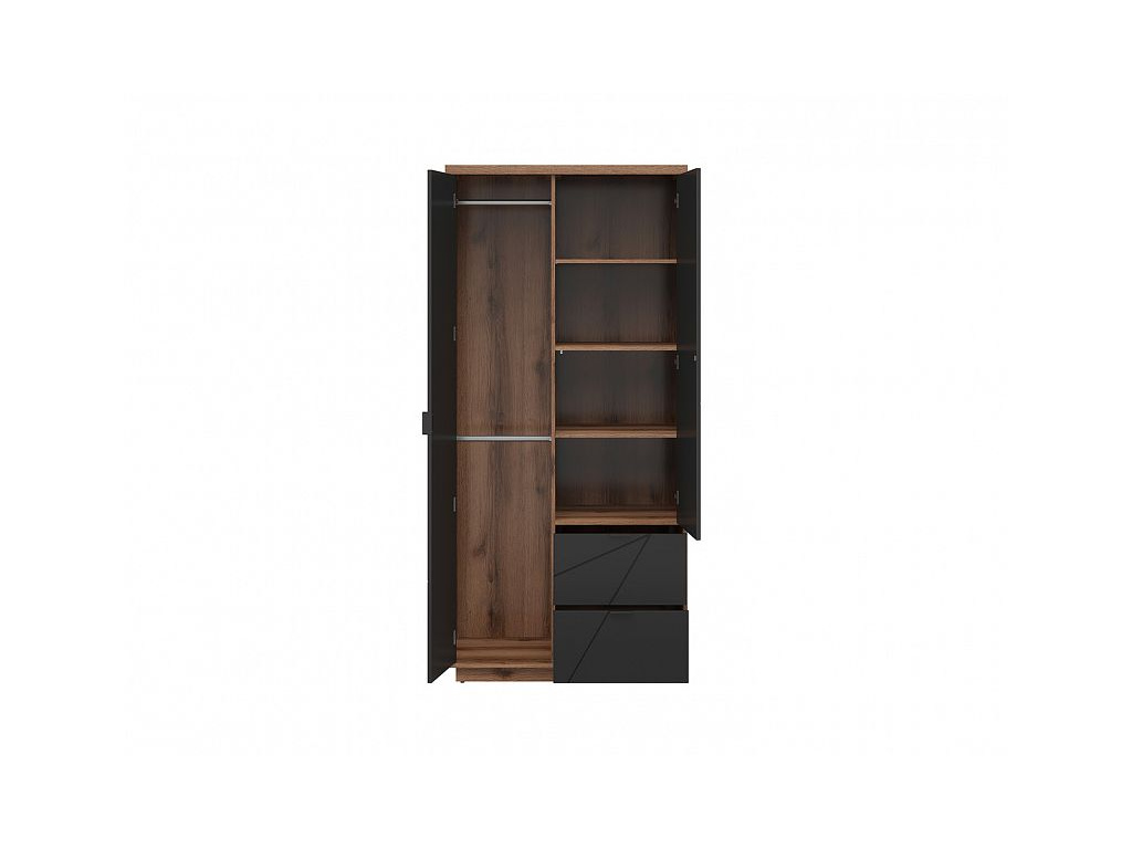 Tato šatní skříň je vyrobena z odolného laminovaného materiálu v dub delano tmavý/černý mat. To znamená, že nejenže bude dlouhodobě sloužit, ale také bude vypadat skvěle. Navíc se hodí k dalším kusům nábytku z kolekce FORN, což vám umožní vytvořit si moderní a luxusní obývací pokoj.