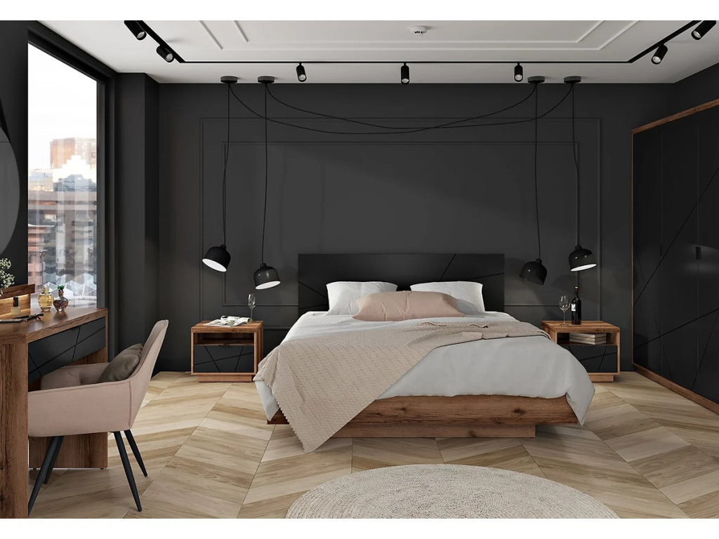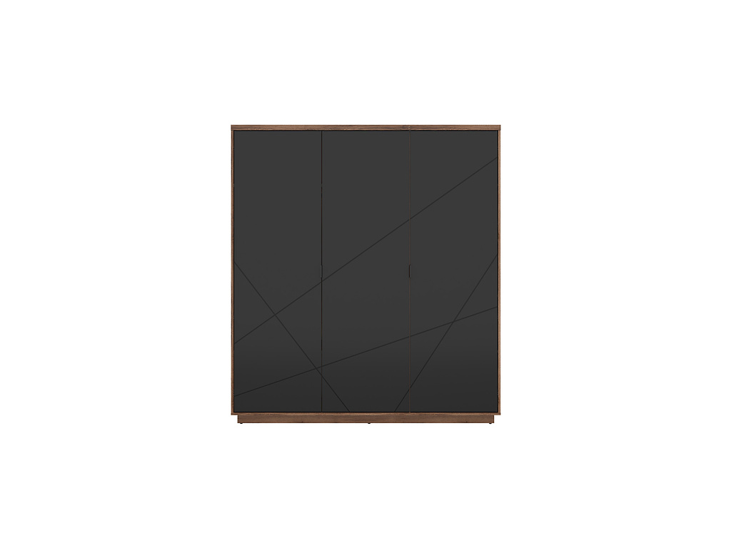 Šatní skříň FORN je nejen praktická, ale i stylová. Je k dispozici v krásném barevném provedení dub delano tmavý/černý mat, které se skvěle hodí do moderního interiéru. Dvířka skříně jsou z MDF potaženy PVC fólií a zdobí je stylové frézované vzory. Kovové úchyty v černém provedení dodávají skříni eleganci a dokreslují její luxusní vzhled.