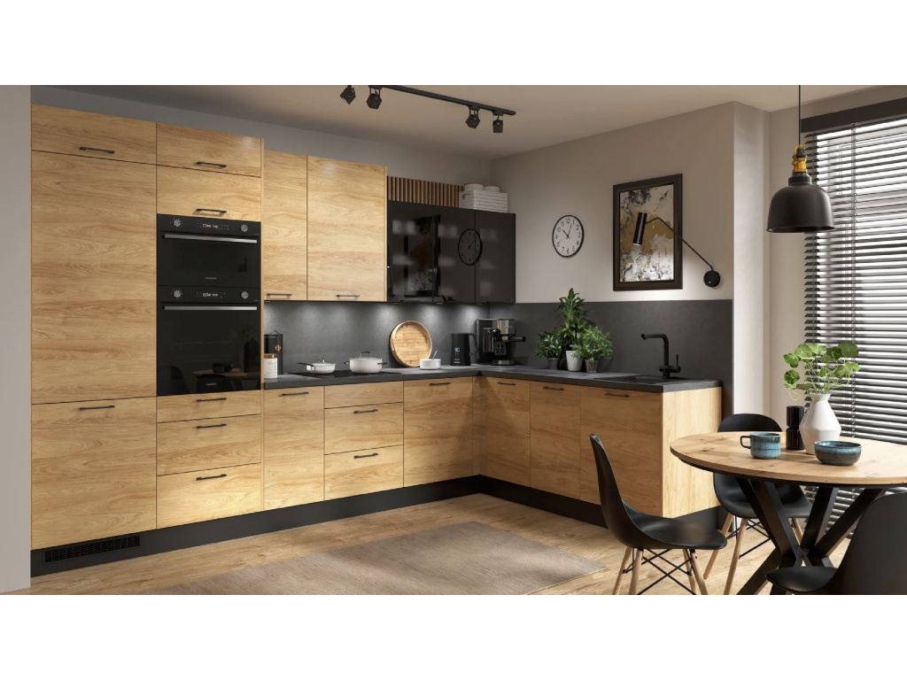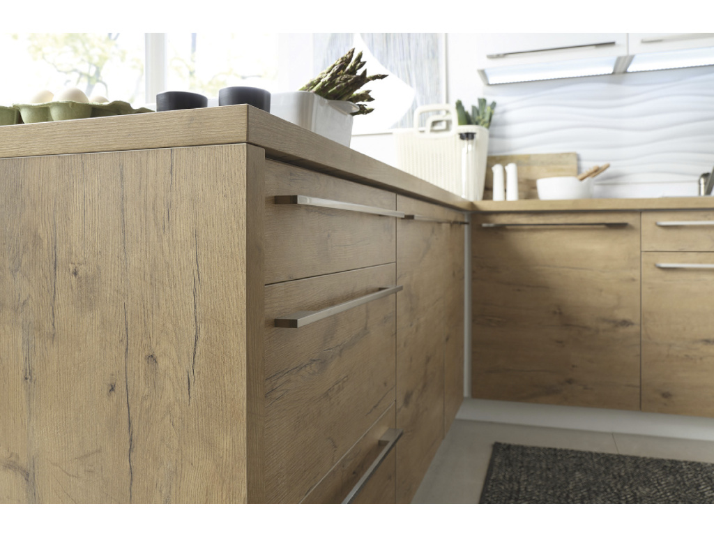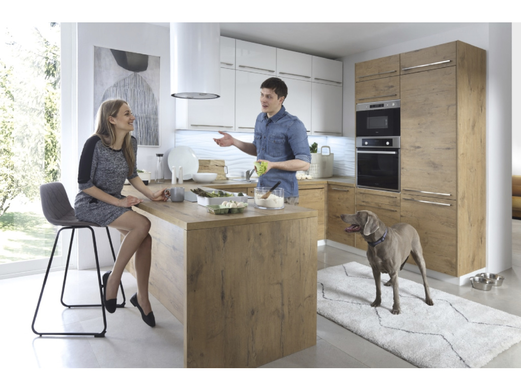 Kolekce kuchyňského nábytku Family Line Hamper je skvělou volbou pro každého, kdo chce ve své kuchyni vytvořit harmonický prostor spojující funkčnost a moderní design. Teplý odstín dub hickory dodává interiéru útulnou atmosféru a zaručuje nadčasový vzhled.