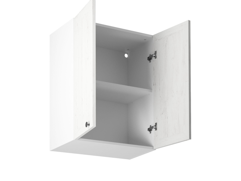Skříňka Prowansja G60 osloví svou přední částí ve stylu borovice andersen, která je zdobena jemnými, avšak výraznými detaily. Příjemným a praktickým doplňkem jsou rovněž stylizované kovové úchyty, které nejenže zvýrazňují rustikální vzhled, ale zároveň usnadňují přístup k uloženým předmětům. Uvnitř skříňky naleznete dostatečně prostornou polici, která poskytne ideální místo pro uspořádání vašich kuchyňských potřeb.